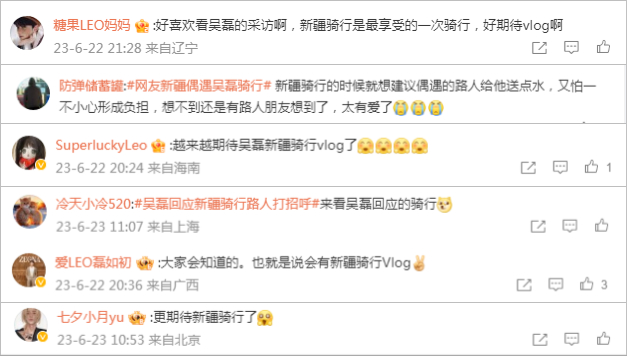 实际上,吴磊新疆骑行之后,不少网友都在等他的Vlog,此次#吴磊回应新疆骑行路人打招呼#上热搜,网友更是纷纷留言表达期待。