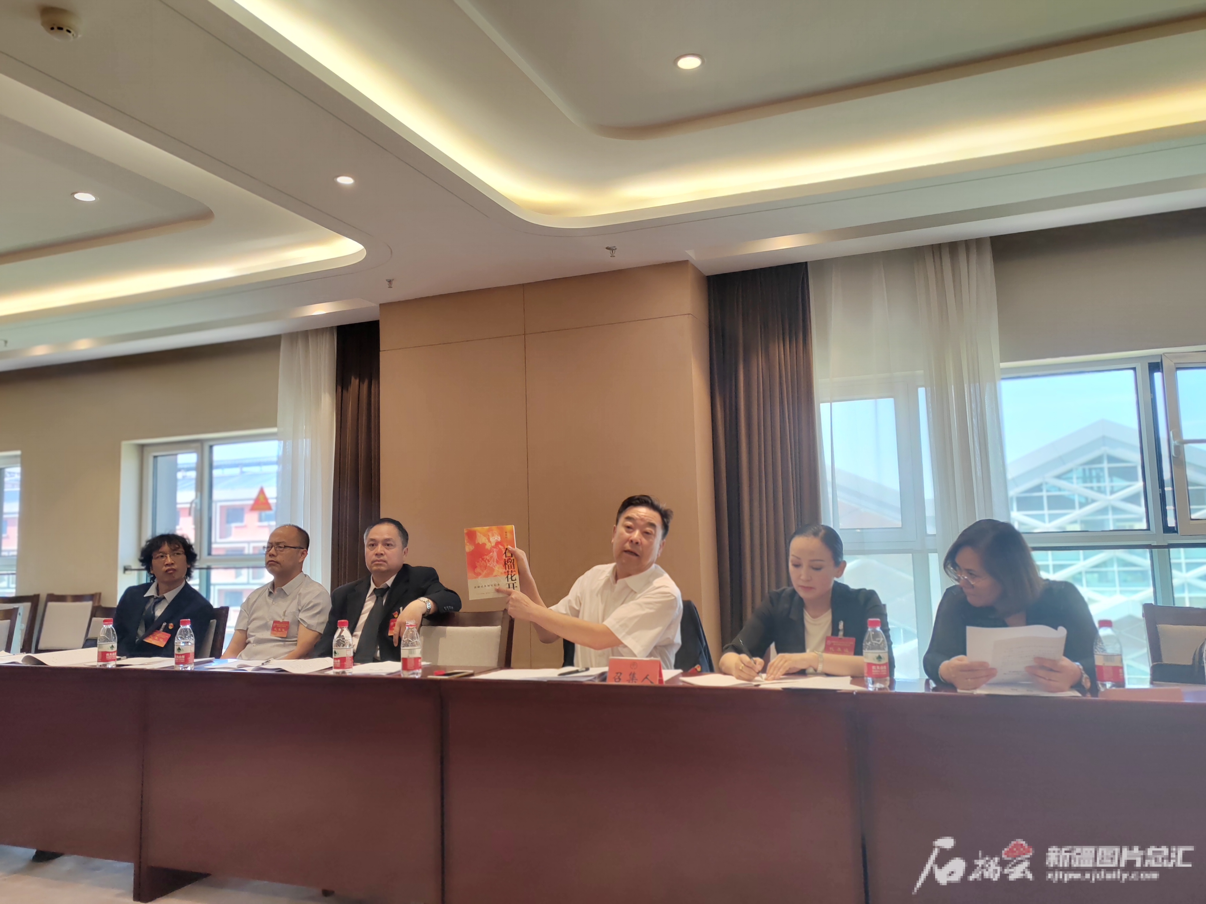 塔城地区文联党组书记、副主席陈冰向与会代表展示即将出版的新书《石榴花开》。石榴云/新疆日报记者 贾春霞摄