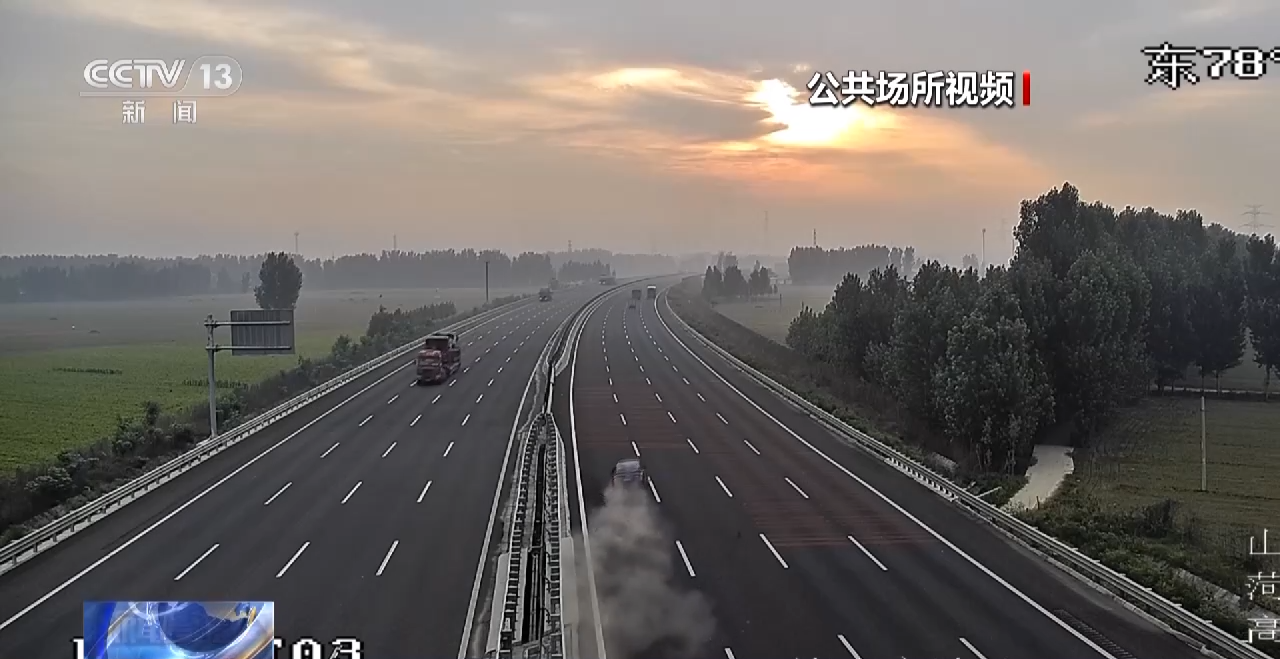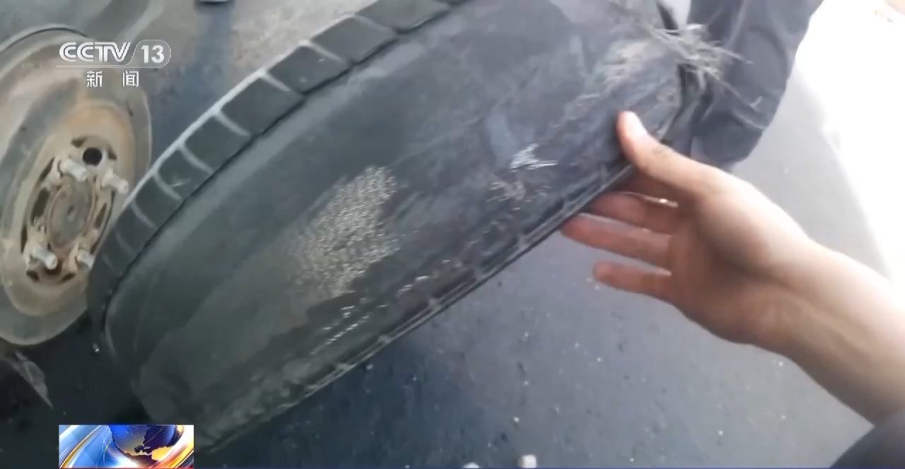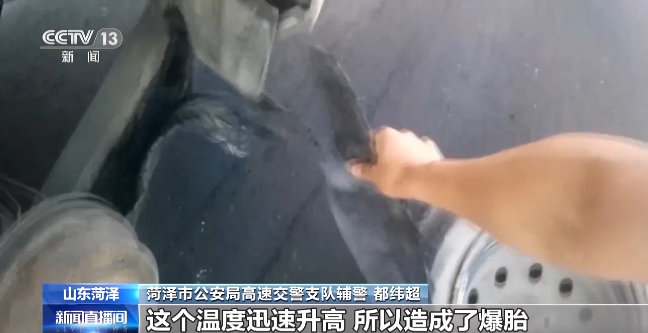 菏泽市公安局高速交警支队辅警 都纬超:首先是轮胎老化,其次是当时的天气高温,轮胎与地面摩擦,温度迅速升高,所以造成了爆胎。