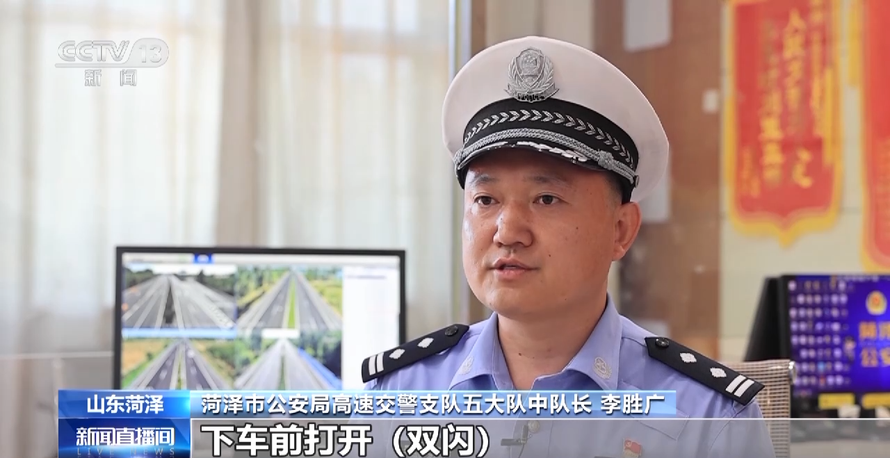 菏泽市公安局高速交警支队五大队中队长 李胜广:发生爆胎时,切勿大幅度打方向盘,也不要猛踩刹车,猛踩刹车会导致汽车偏离车道,很容易撞上高速护栏,正确的方法是扶稳方向盘,松开油门,轻踩刹车,让车辆缓慢停下来,开进应急车道后,下车前打开双闪,沿护栏在车辆后方150米处放置警示标志或警示牌,然后等待救援。