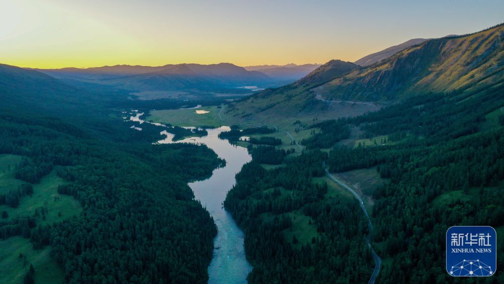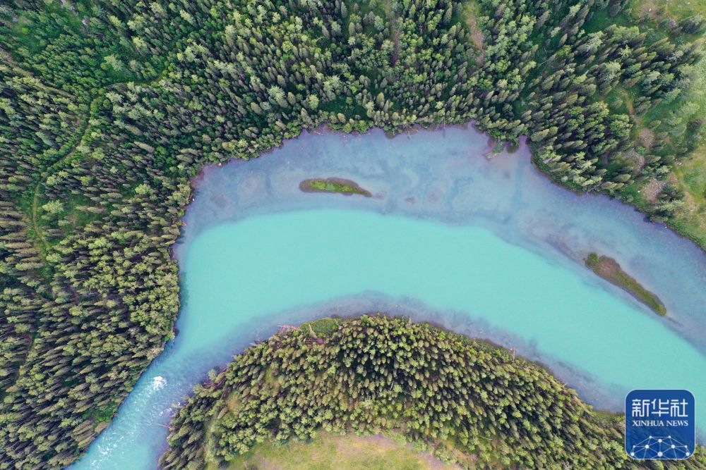 ↑7月19日拍摄的新疆阿勒泰地区喀纳斯景区风光(无人机照片)。