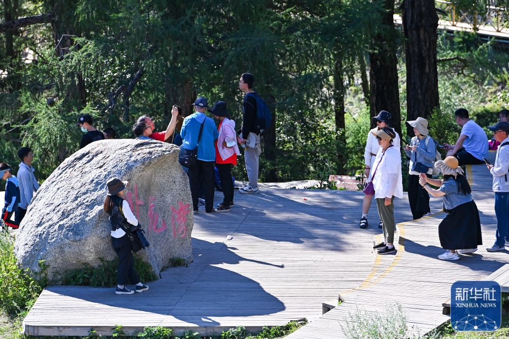 ↑游客在新疆阿勒泰地区喀纳斯景区内的卧龙湾打卡拍照(7月19日摄)。