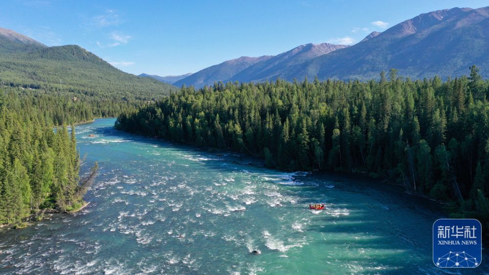 ↑游客在新疆阿勒泰地区喀纳斯景区体验漂流项目(7月19日摄,无人机照片)。