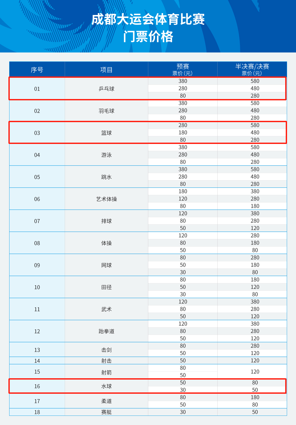 预计明天开售的篮球、乒乓球、水球门票价格如下: