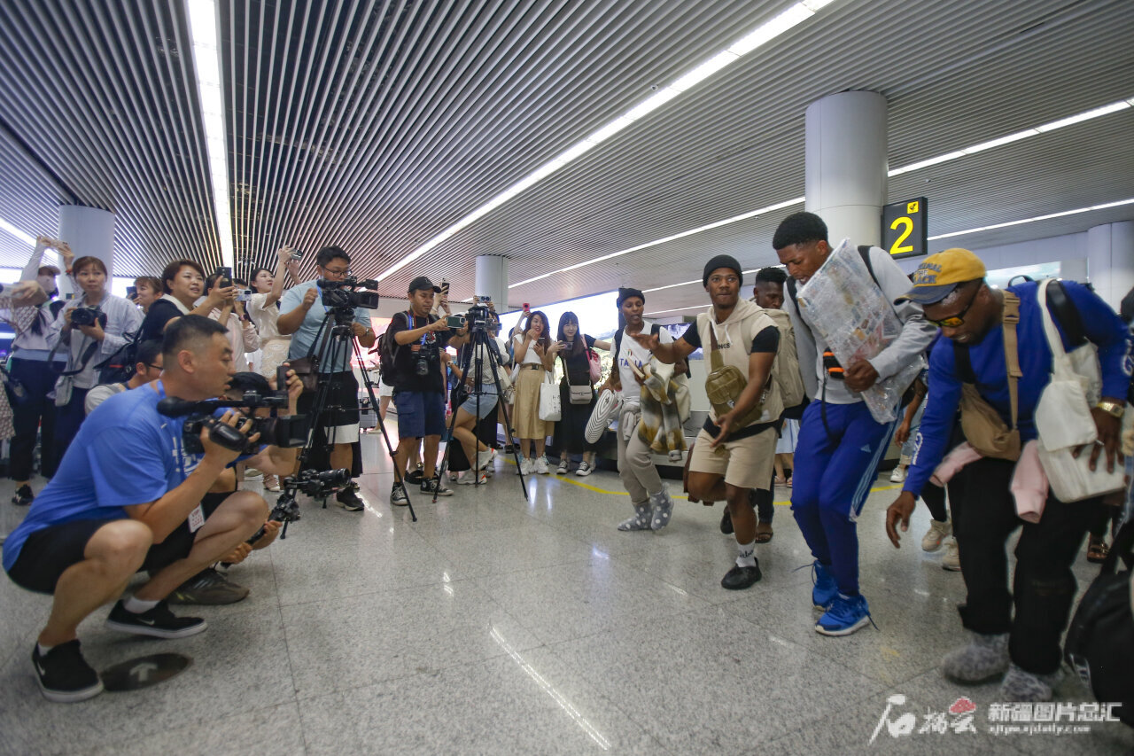 南非埃尔维斯舞蹈艺术团抵达乌鲁木齐地窝堡国际机场时,团员们被媒体包围。
