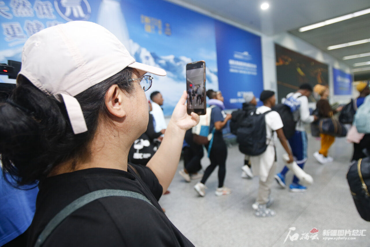 南非埃尔维斯舞蹈艺术团抵达乌鲁木齐地窝堡国际机场时,一位抵乌乘客用手机记录。