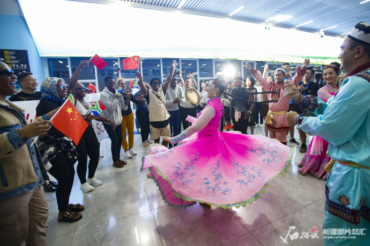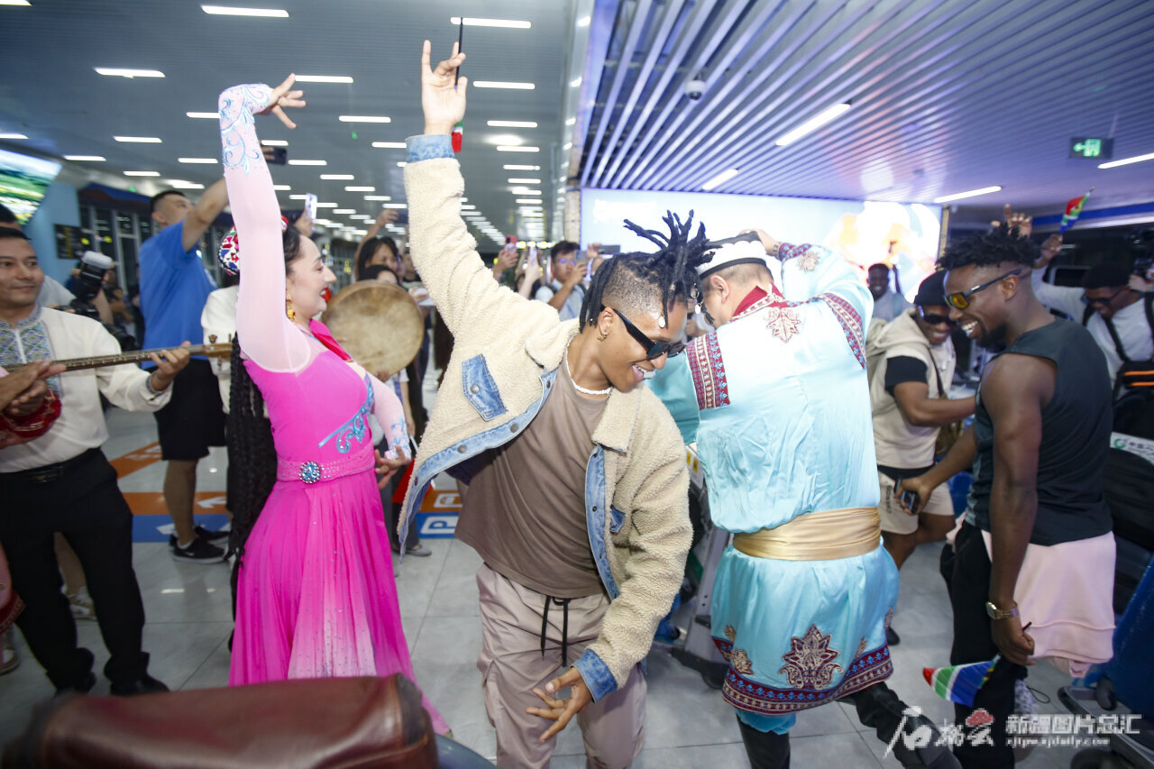 当日,主办方以快闪的方式,在机场欢迎南非埃尔维斯舞蹈艺术团,新疆艺术剧院木卡姆艺术团的演员用热情的维吾尔族舞蹈迎接远道而来的客人。埃尔维斯舞蹈艺术团的舞者,也以南非特色的舞蹈融入其中。该艺术团将于7月24日-25日,在新疆人民剧场为观众奉上舞剧《乌班图之魂》。
