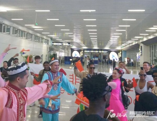 7月23日晚,南非埃尔维斯舞蹈艺术团抵达乌鲁木齐地窝堡国际机场时,新疆艺术剧院木卡姆艺术团的演员以快闪的方式欢迎。石榴云/新疆日报记者 玛依古丽·艾依提哈孜 摄