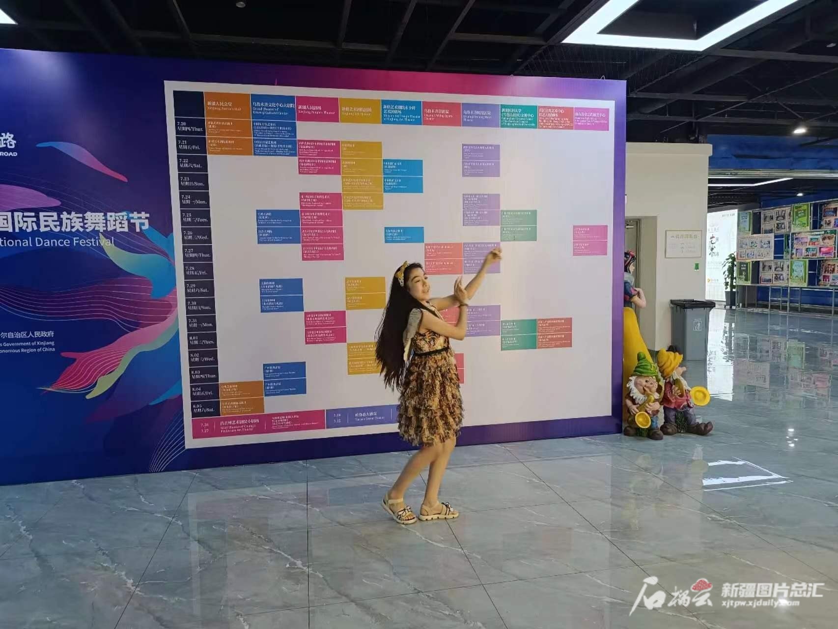 观众维丽丹·玉素甫江出生于2011年,那年举办了第二届中国新疆国际民族舞蹈节。如今,小姑娘已经成为舞者,上过中央广播电视总台的舞蹈节目、参加过国际比赛。这届舞蹈节上,她和家人一起来看这台歌舞晚会。演出中场休息时间,她技痒难忍,比划了几个舞蹈动作,被现场记者捕捉到。盛邀之下,她即兴在剧院大厅里起舞,“她可以说是和舞蹈节一起成长的,祝愿舞蹈节一届比一届精彩。”维丽丹的哥哥祝福舞蹈节。