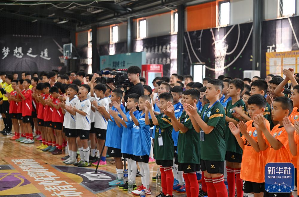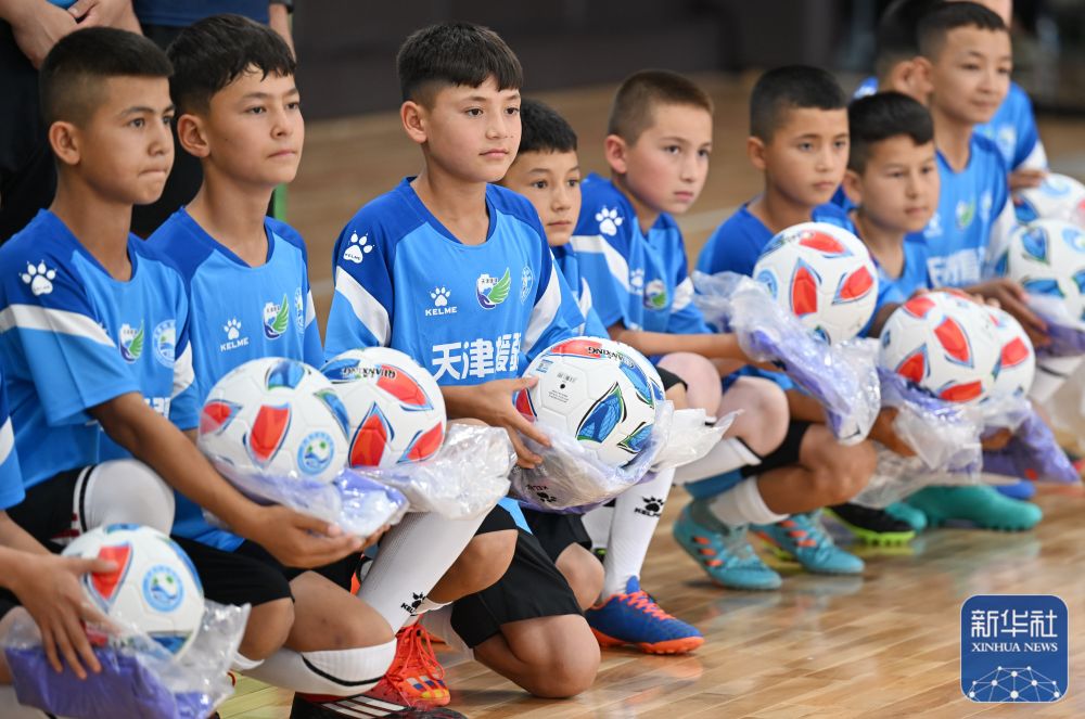 ↑来自新疆和田的小球员们在启动仪式现场领取足球和队服。