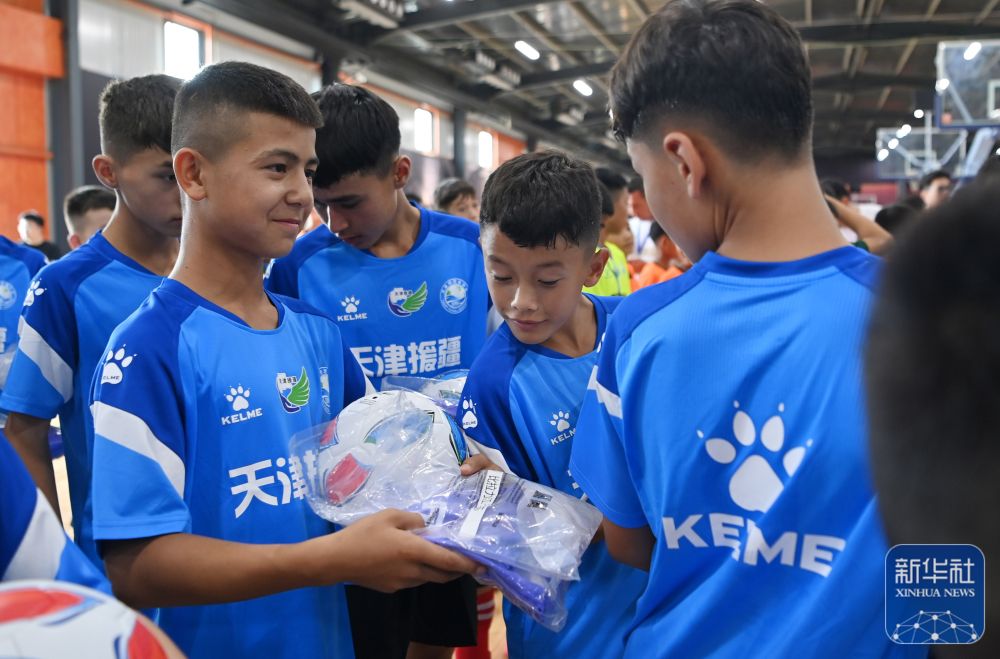 ↑来自新疆和田的小球员展示自己刚领取的足球和队服。