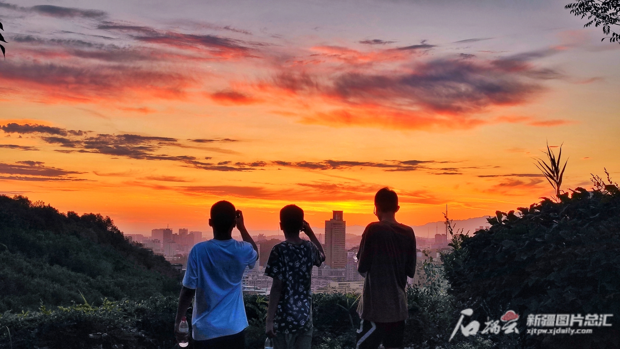 8月1日早晨,乌鲁木齐天气晴朗,几名少年在雅山公园观赏日出。石榴云/新疆日报记者 张万德摄