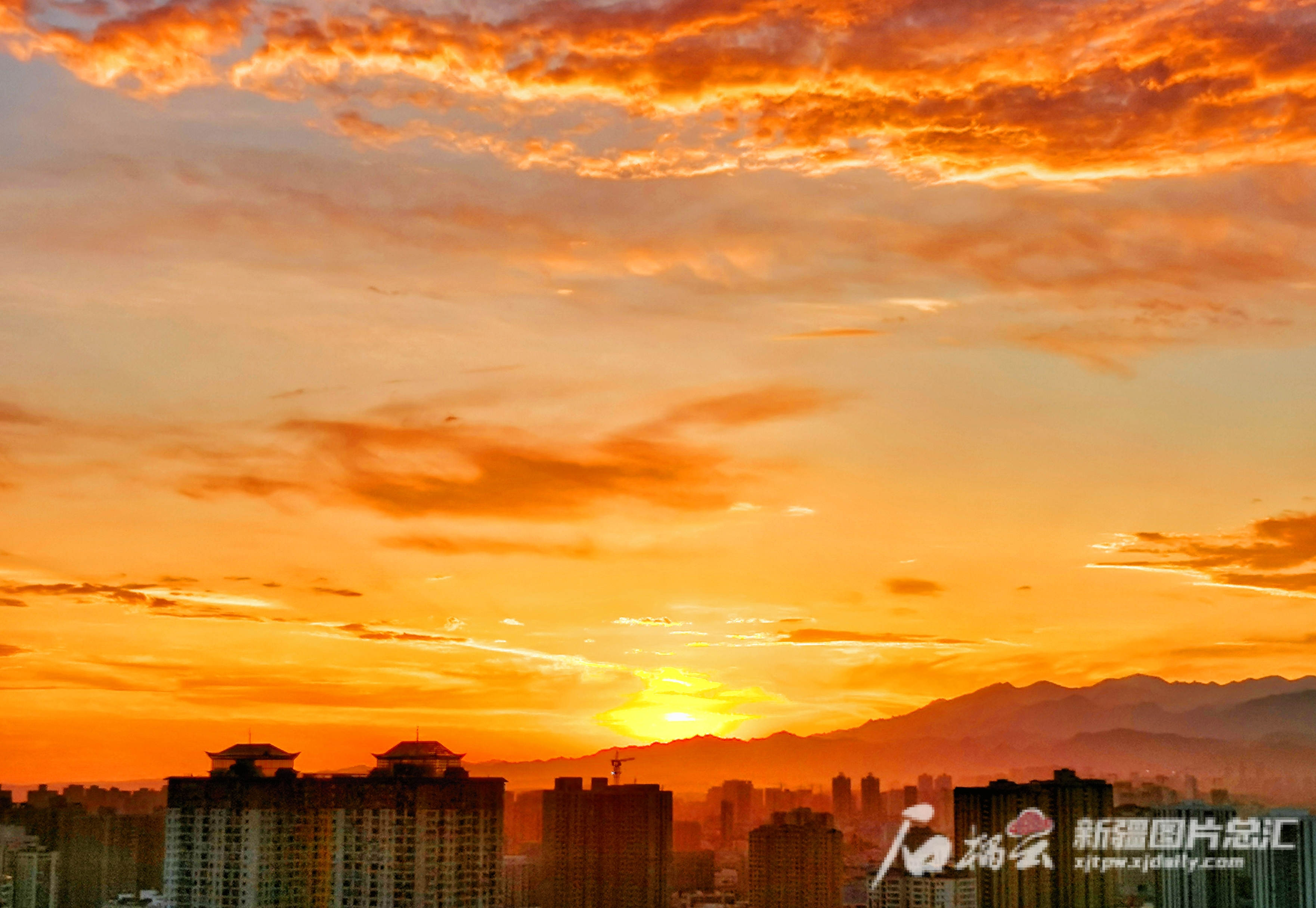 8月1日清晨,乌鲁木齐市天气晴好,即将初升的朝阳将东方天空染得一片火红。石榴云/新疆日报记者 杨伟摄