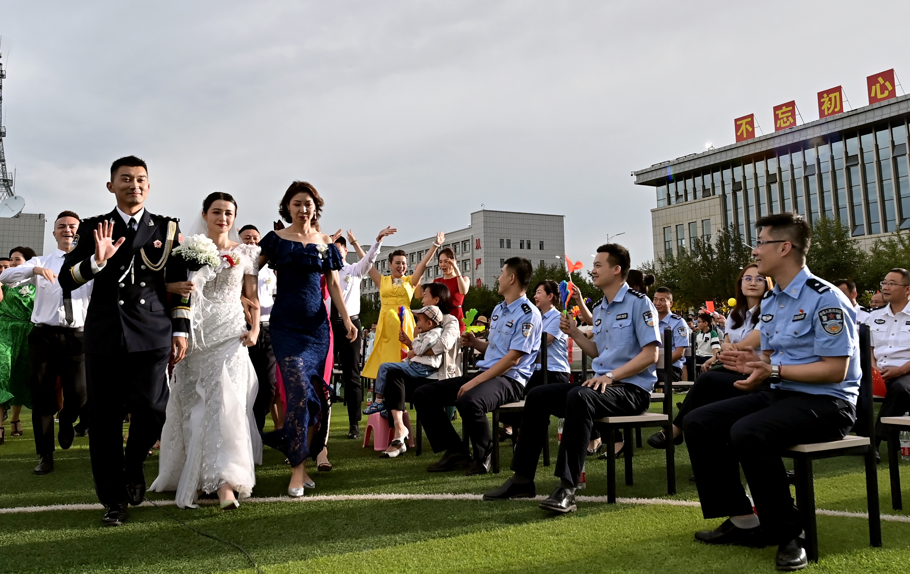 乌鲁木齐市公安局特警八支队民警艾孜买提·艾尼娃尔在警营迎娶新娘。石榴云/新疆法制报记者 单坤摄