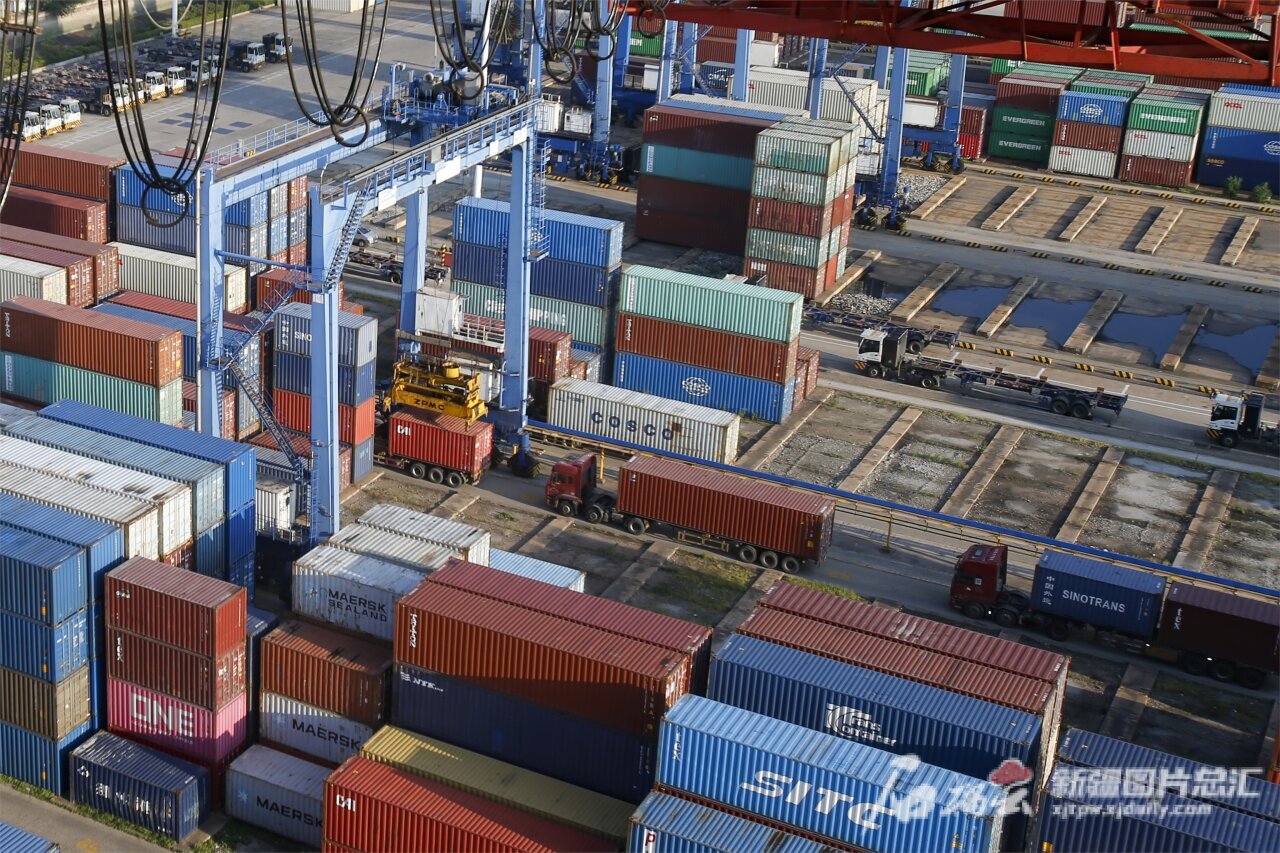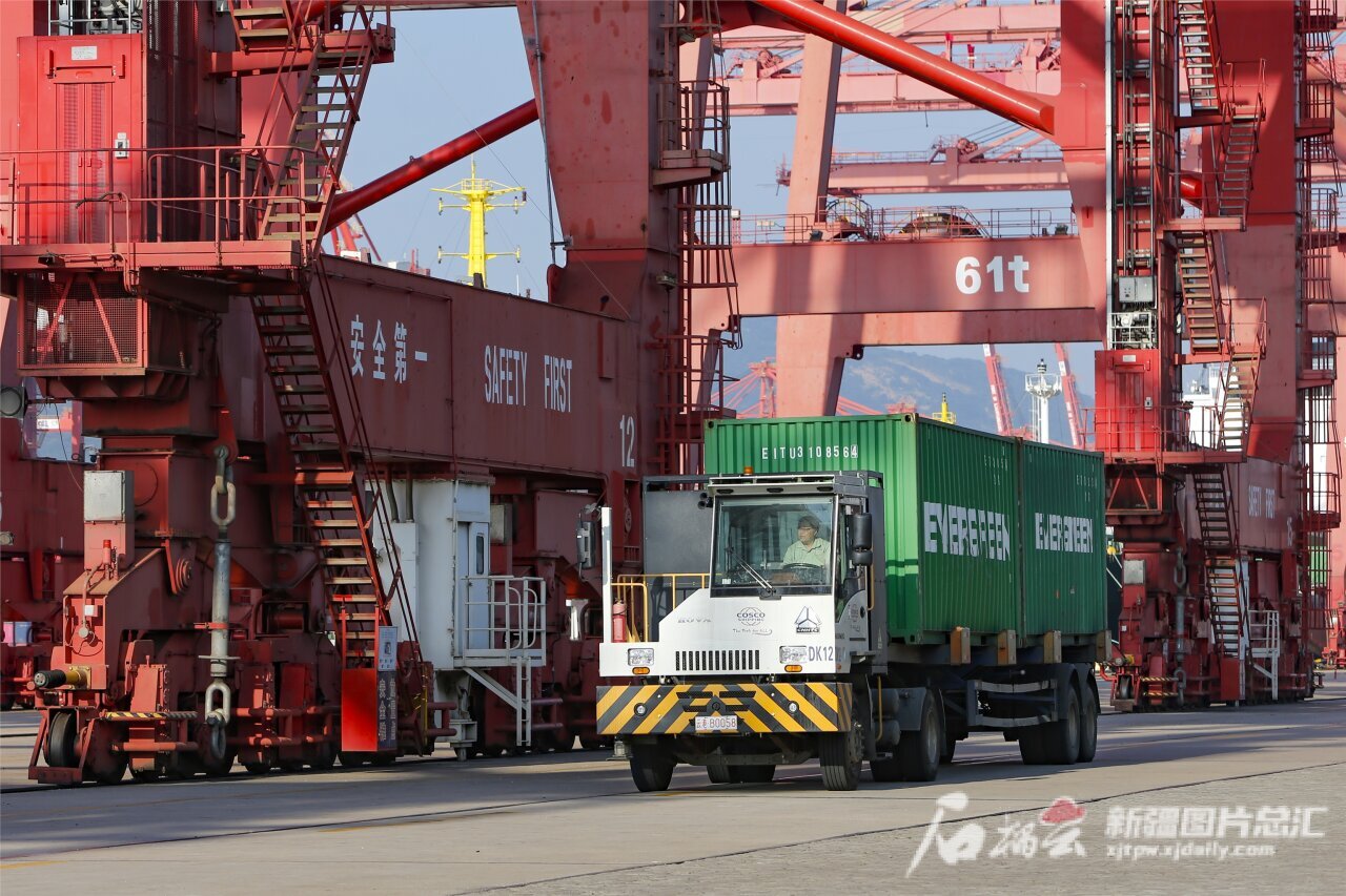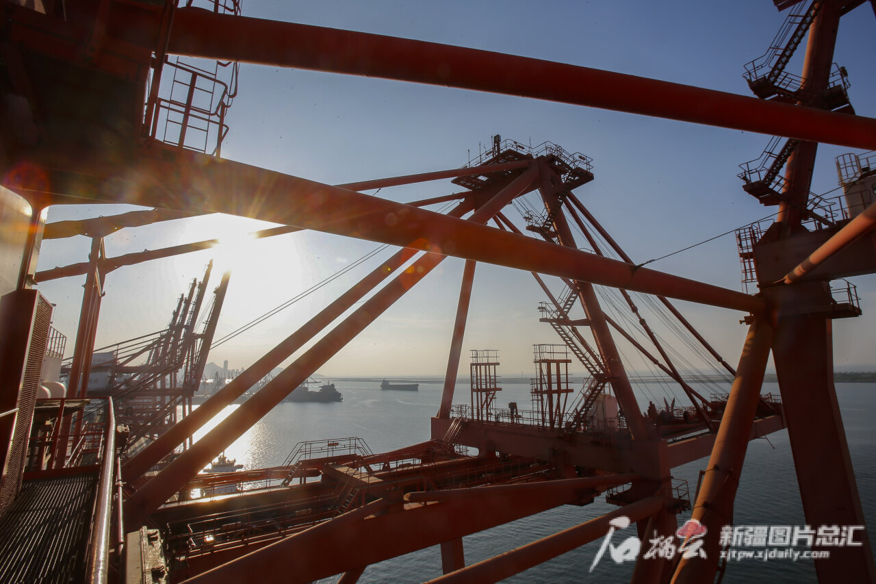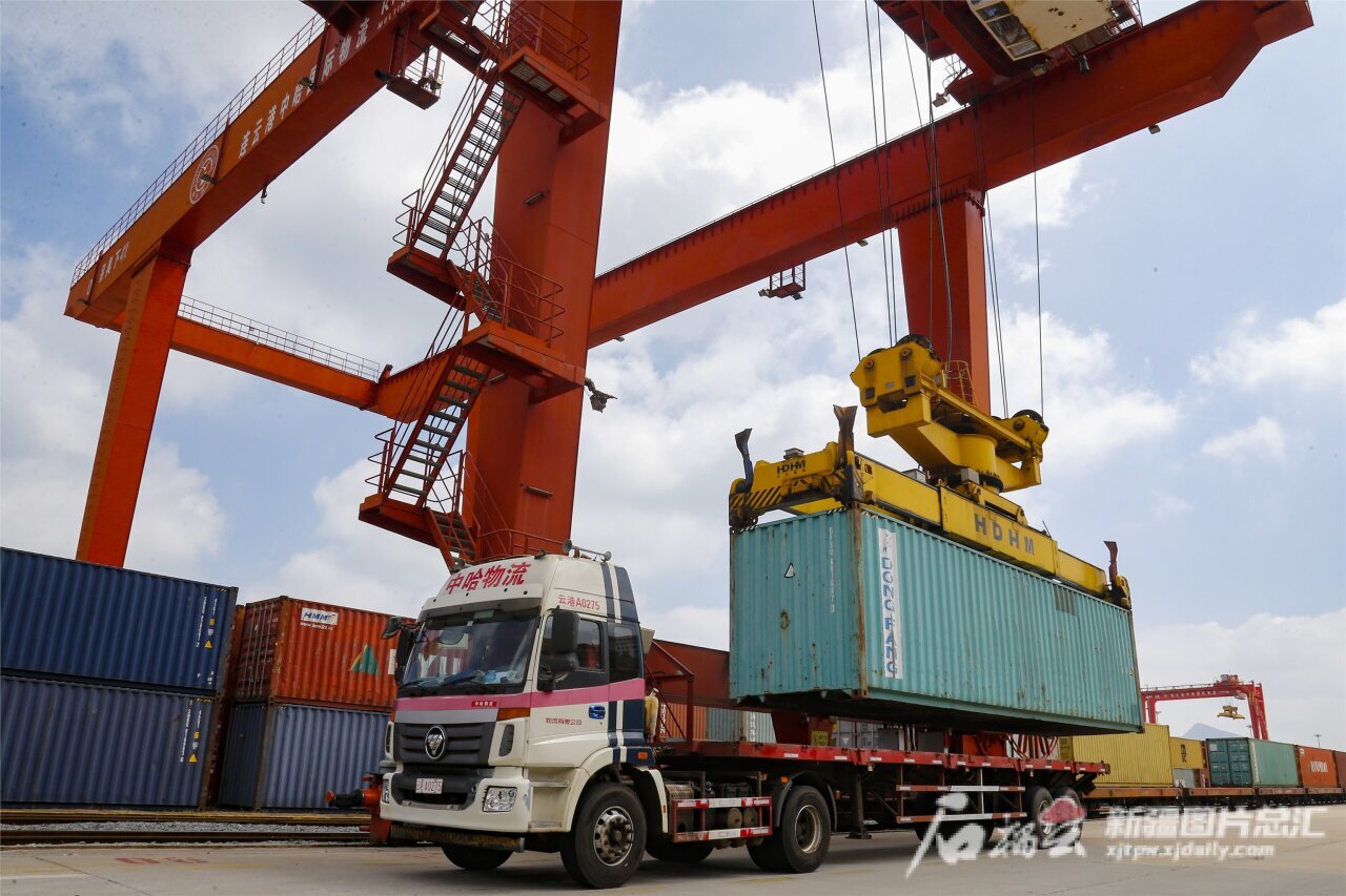 8月7日,在中哈(连云港)物流合作基地数字化调度中心大屏幕上,中欧班列累计到发量、集装箱进出场箱量、国际班列运量等各项数据一目了然。在物流合作基地集装箱场站,工作人员指挥龙门吊装载货物,一列列中欧班列蓄势待发,准备一路向西。不远处的连云港港口,一辆辆集装箱牵引车来回穿梭,把刚吊装下船的集装箱运往指定箱区,或是从箱区把集装箱拉运吊装上船,如此反复,高效运转。