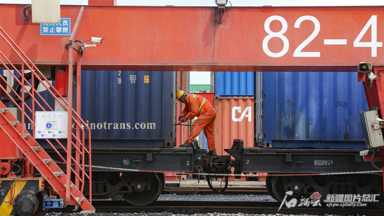 8月7日,工作人员在中哈(连云港)物流合作基地集装箱场站紧固装载在列车上的集装箱。