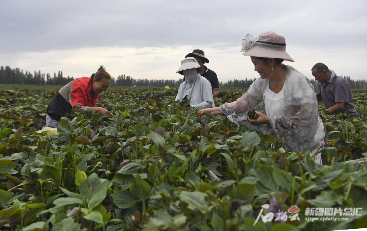 7月27日,巩留县阿克吐别克镇唐努尔村的村民在采摘紫苏。中草药种植如今已成为当地群众增收致富重要途径。石榴云/新疆日报记者 汤永摄