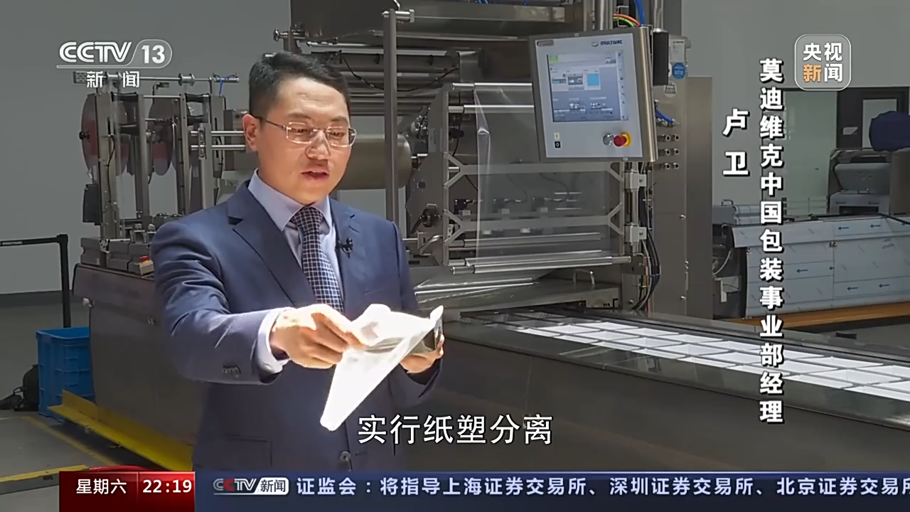 莫迪维克中国包装事业部经理 卢卫:我用完这个包装以后,可以把下面的底膜跟下面的基材实行纸塑分离,分离后的纸塑,就可以作为环保材料自然降解,剩下的薄膜部分可以作为干垃圾回收去发电。