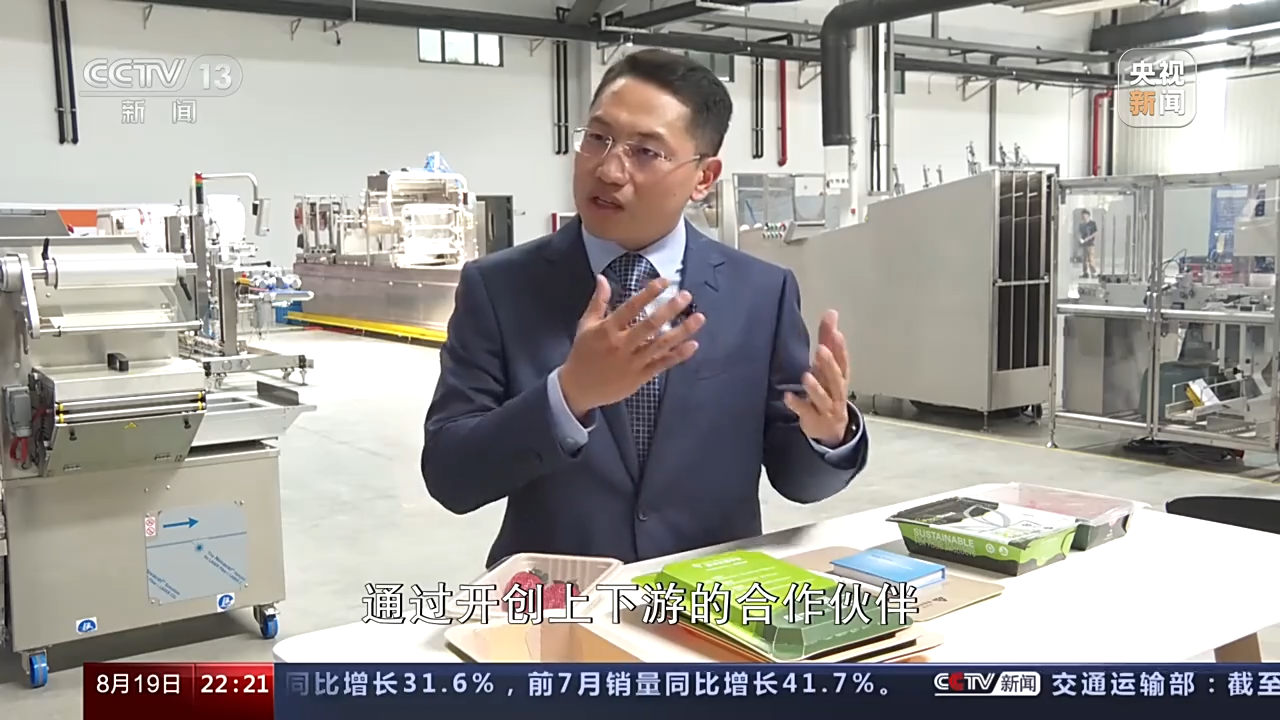 莫迪维克中国包装事业部经理 卢卫:比如说肉,肉的话它需要具有很好的保质期,除了温度、微生物控制以外,尤其是阻氧性、阻水性这种要求都非常高,这其实很难通过一种材料来实现。最难的是既要环保,又把功能性做到很好,既要环保、又要功能是一个非常难的课题。就是我用更薄的塑料功能层,但是我托盒基材用纸塑,那纸塑的盒我可以大量节省塑料材料。我们最核心的技术,把纸这种不具备功能性的东西和这种膜,这种具有功能性的东西,两者结合在一起。