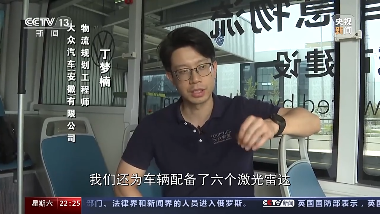 大众汽车(安徽)有限公司物流规划工程师 丁梦楠:我们一共配备了四个摄像头,能够通过视觉识别路上的行人、车辆、红绿灯,我们还为车辆配备了六个激光雷达,是用于扫描车辆周围的障碍物以及探测、距离感知。车辆还配备了一个厘米级别精度的车道定位的芯片,在我们驾驶过程中实现车辆厘米级别定位的行驶。
