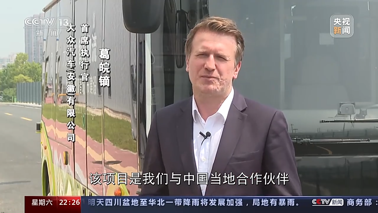 大众汽车(安徽)有限公司首席执行官 葛皖镝:它是L4级自动驾驶巴士,该项目是我们与中国当地合作伙伴及当地政府共同开发的,我们对此项目成果深感自豪。这个项目在安徽省尚属首例,也是中国首批应用实例。我们与合肥市政府的合作成果颇丰、非常密切。我们有共同的愿景、共享资源、在人才、投资和创新方面通力合作,我身后就是合作的证明。