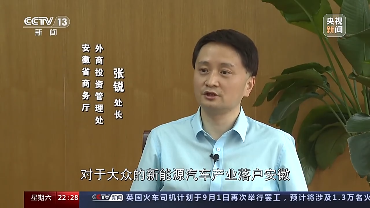 安徽省商务厅外商投资管理处处长 张锐:合肥具有完备的新能源汽车产业链,因为现在有几千家的新能源汽车的配套厂已经在合肥落户了,包括一些国内的知名的汽车厂商。因为在合肥已经形成了新能源汽车的产业集群,所以说我觉得对于大众的新能源汽车产业,落户安徽应该有很大的优势和吸引力。