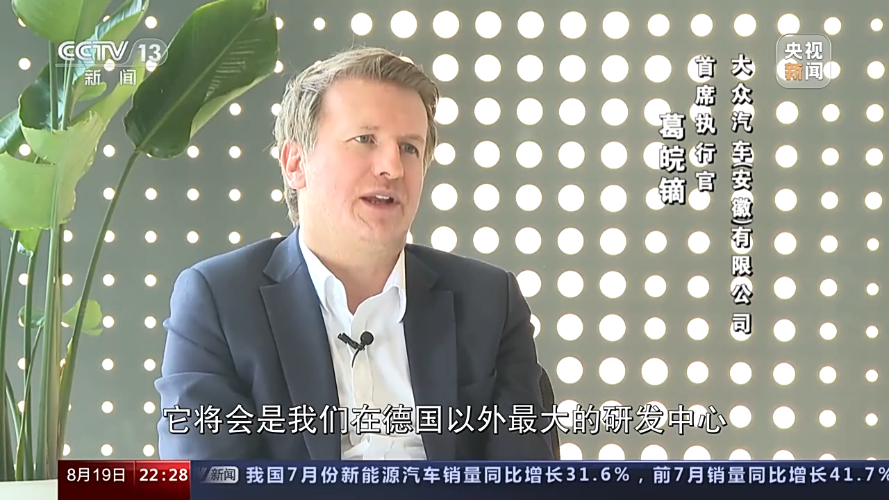 大众汽车(安徽)有限公司首席执行官 葛皖镝:我的中文名字是葛皖镝。我非常喜欢葛皖镝这个名字,因为它和安徽紧密相关,这个名字听起来也很像安徽。中国汽车市场的电动化非常迅速,中国和大众汽车有着深厚的历史渊源,我们将在此基础上继续发展。我们希望在电动汽车时代继续发挥引领作用。我们将深化“在中国,为中国”战略,希望按照相应的速度满足中国客户的真实诉求,这样才能在市场上保持竞争力。