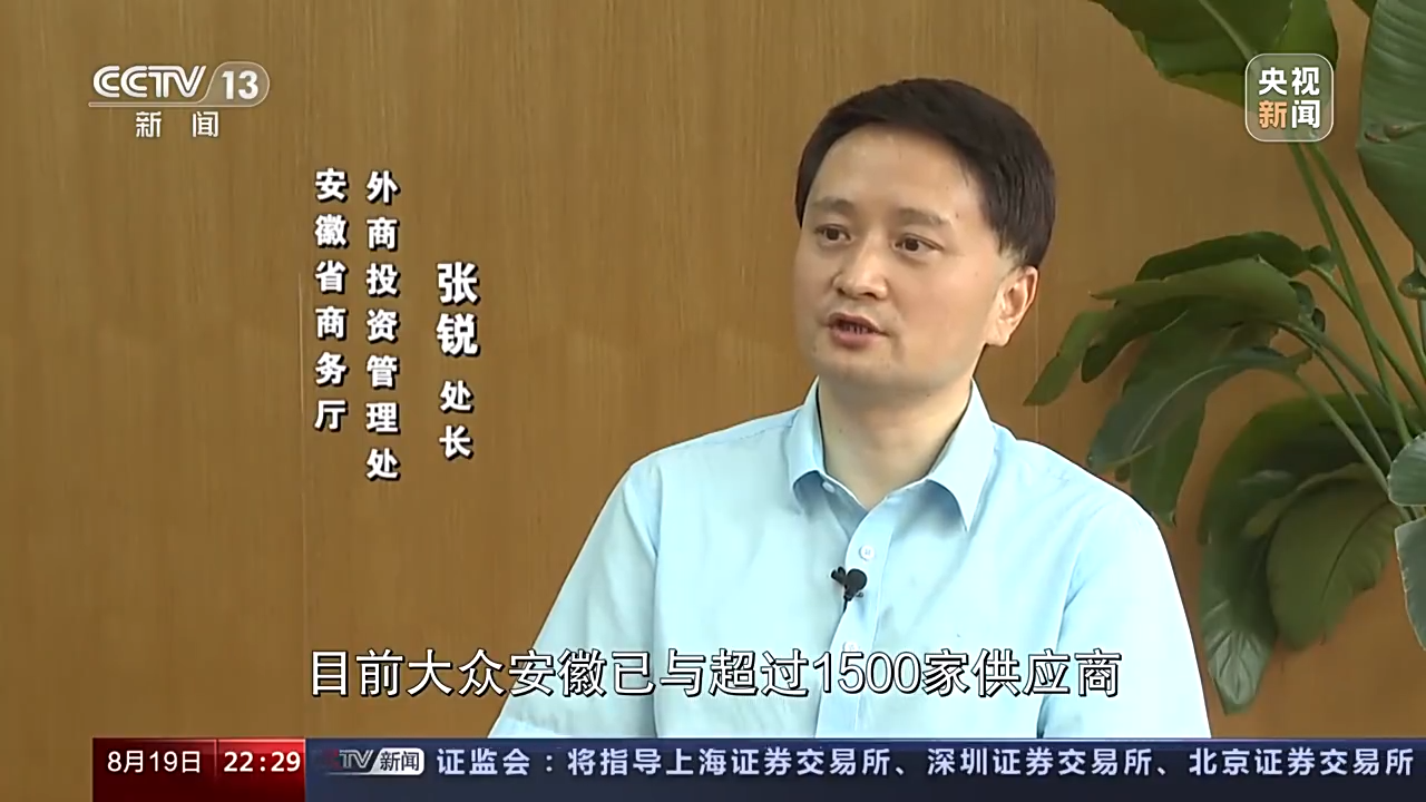 安徽省商务厅外商投资管理处处长 张锐:应该说这对安徽打造新能源产业链的生态注入了强大的动力,目前大众安徽已与超过1500家供应商建立了合作关系,其中超过20家参与了新能源汽车制造的关键供应商,都位于合肥。通过建立了包括生产、研发、测试、市场销售,与客户服务这一条完整的价值链,大众已经成为合肥新能源汽车生产系统的重要组成部分。