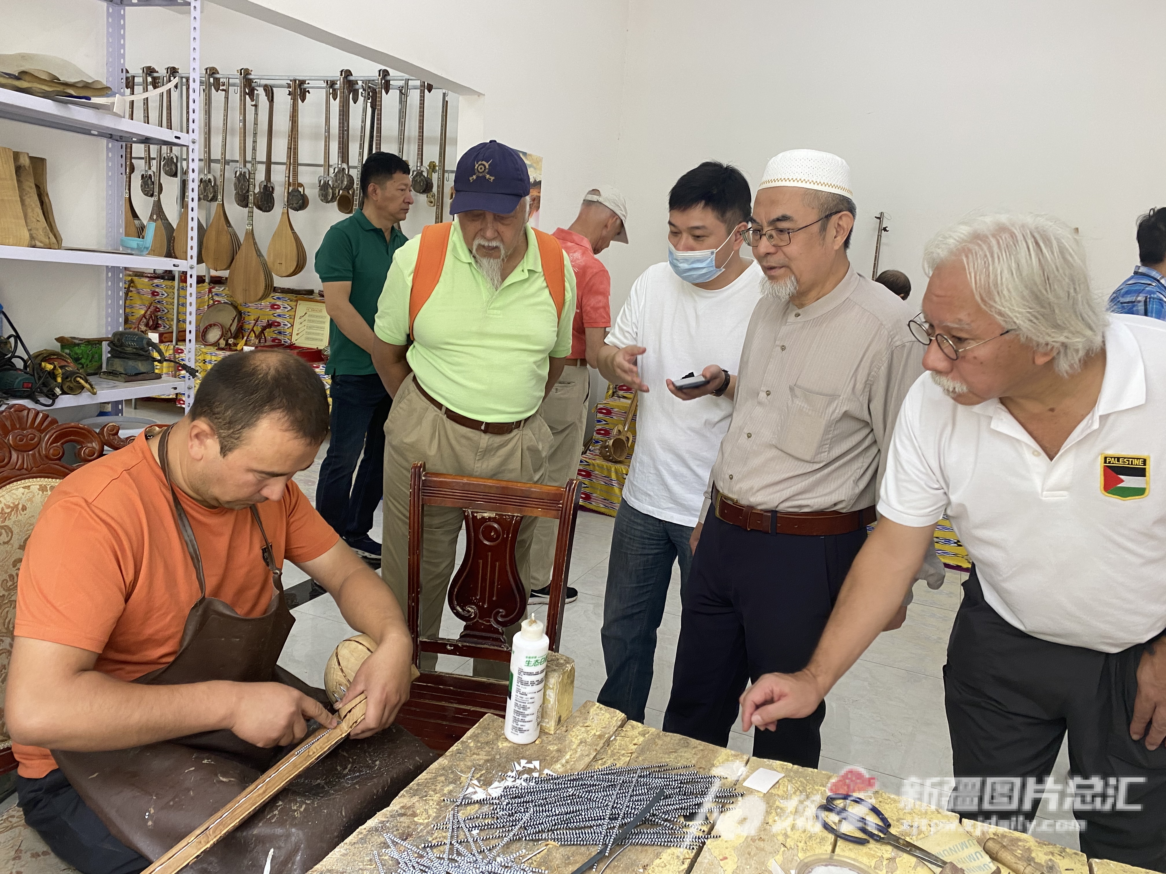 8月19日,代表团在疏附县中国新疆民族乐器村观看工匠制作乐器。石榴云/新疆日报记者沈祖孝 摄