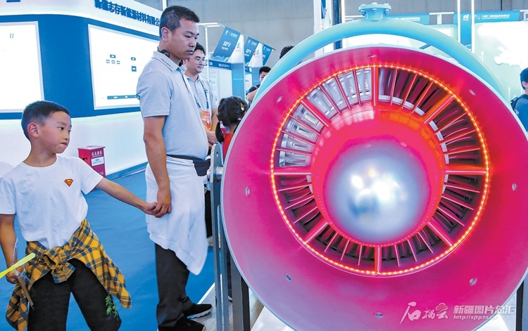 8月19日,观众在参观中国航发燃气轮机有限公司展出的燃气轮机。