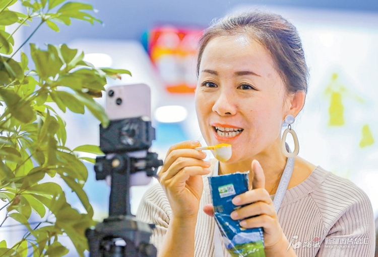8月19日,塔城地区展厅工作人员在直播推介农产品。