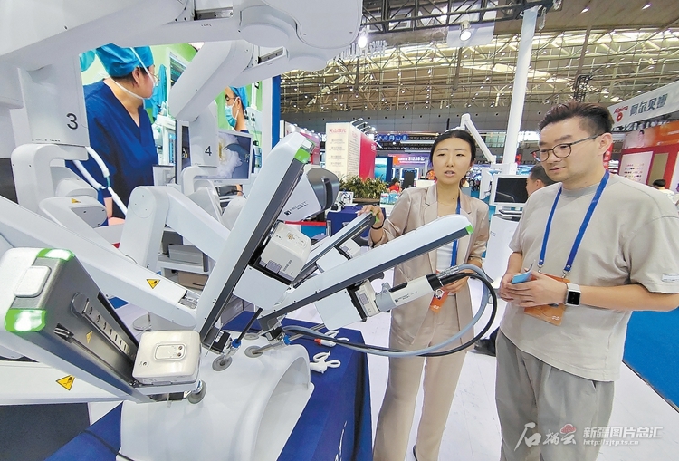 8月19日,参展商在上海微创医疗机器人(集团)股份有限公司展台了解微创手术机器人产品性能。