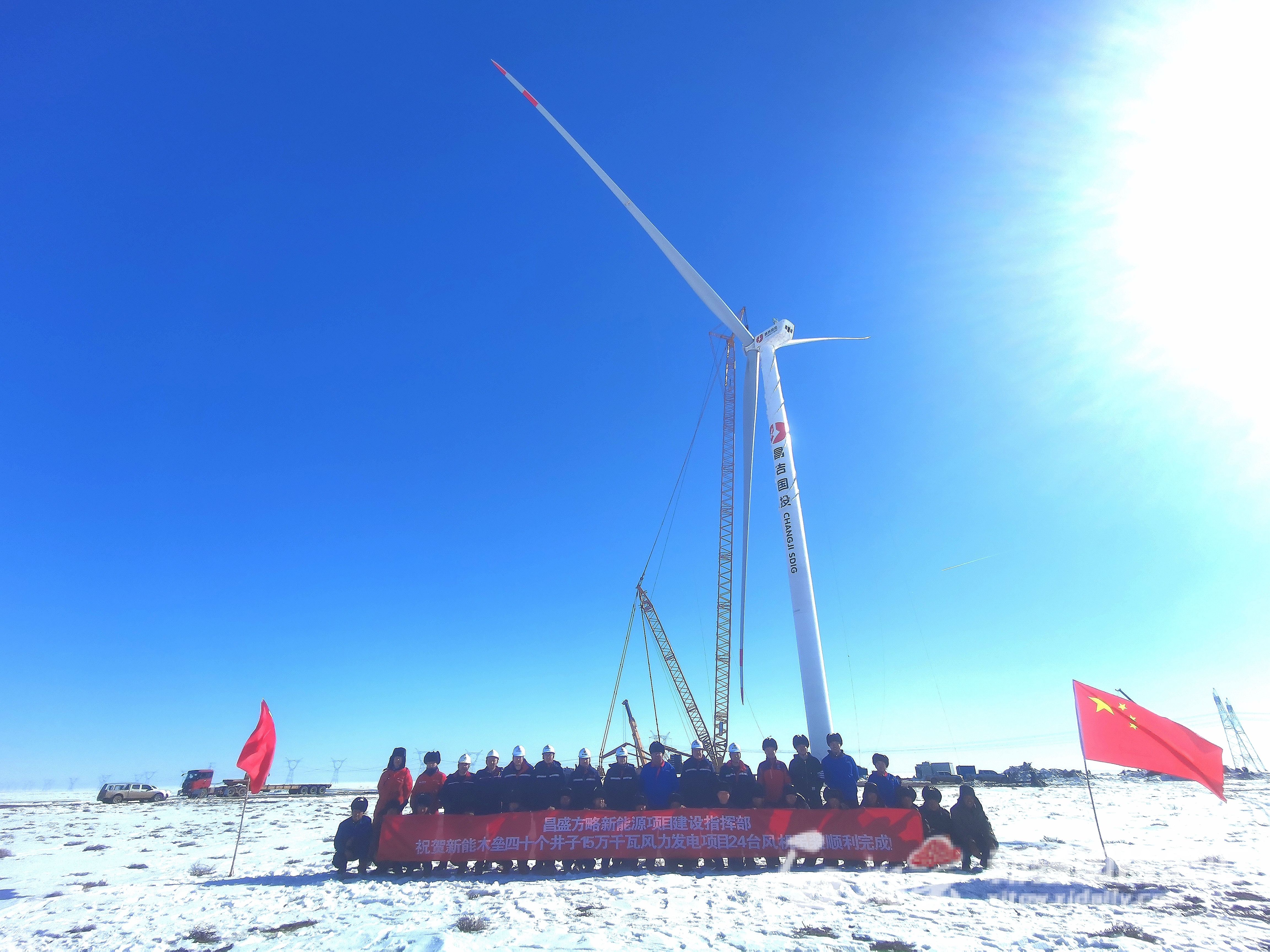 2月21日,昌吉州国有资产投资经营集团有限公司在木垒哈萨克自治县四十个井子15万千瓦风电项目风机吊装作业完成。王新勇摄