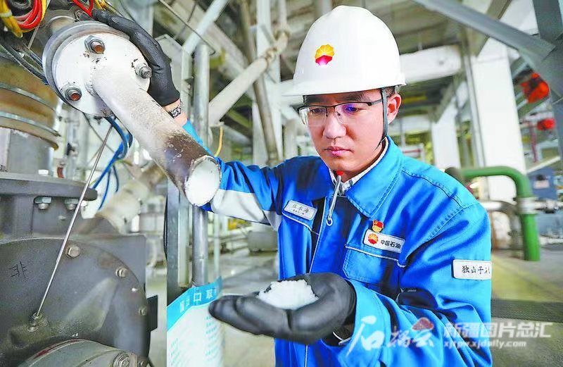 7月26日,中国石油独山子石化公司干部张永海正在检查茂金属树脂产品外观质量。该公司是国内唯一实现茂金属聚乙烯薄膜专用料系列化生产的企业,打破国外高端进口产品垄断。李秦摄