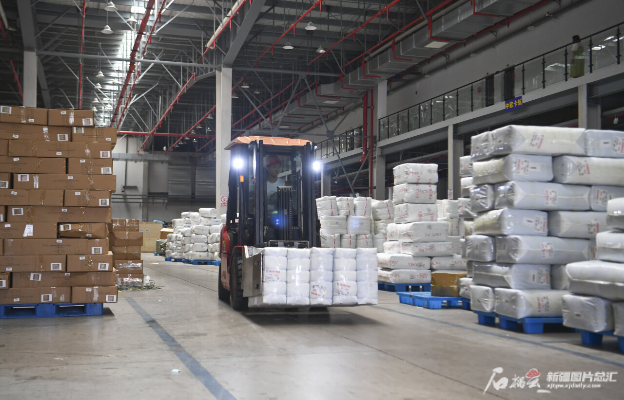 8月19日,浙江义陆航国际供应链有限责任公司员工装运经新疆巴克图口岸发往欧洲的货物。
