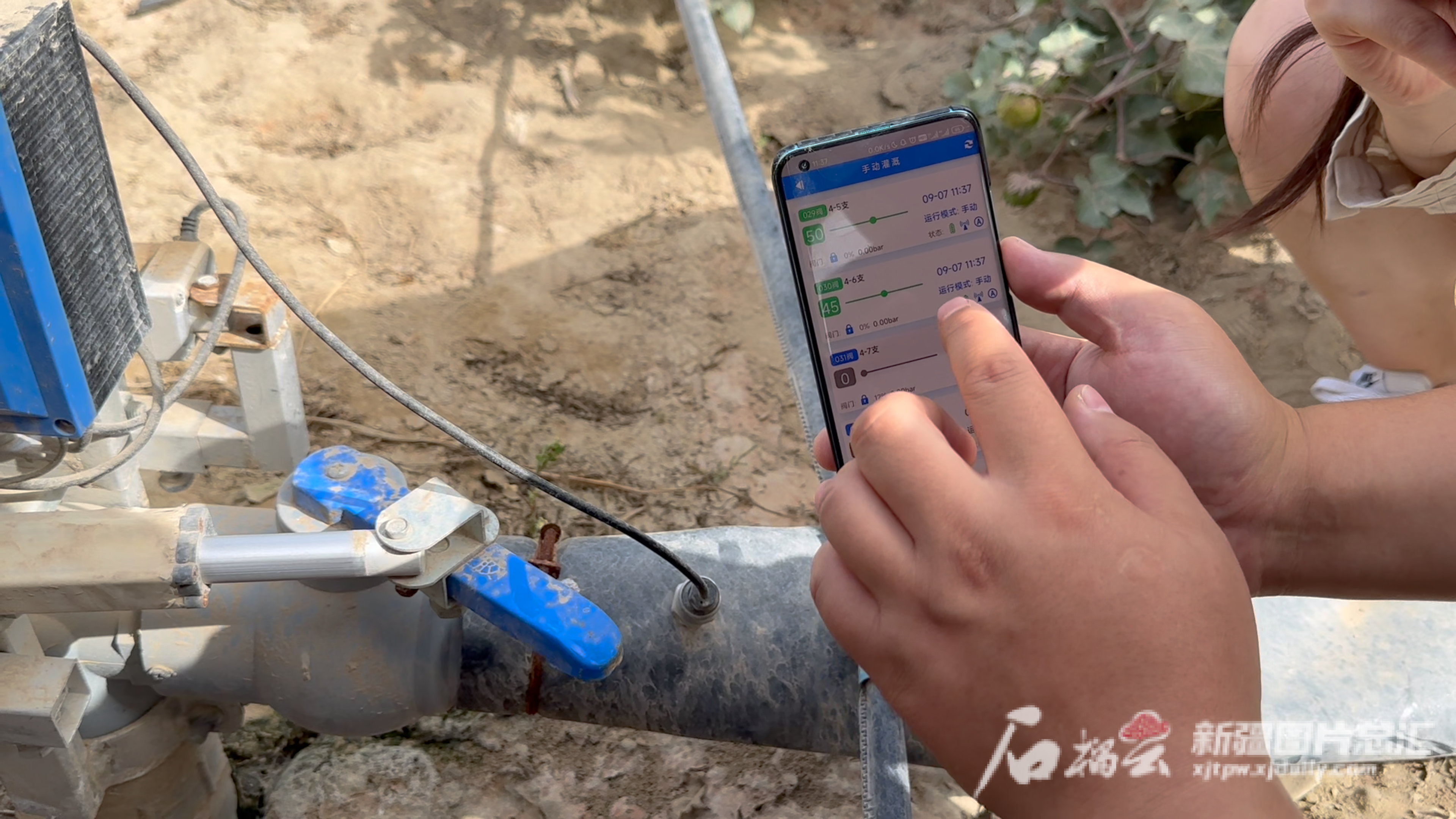 技术员正在手机上操作智能阀门角度控制滴灌水量。石榴云/新疆日报记者 汪舟摄