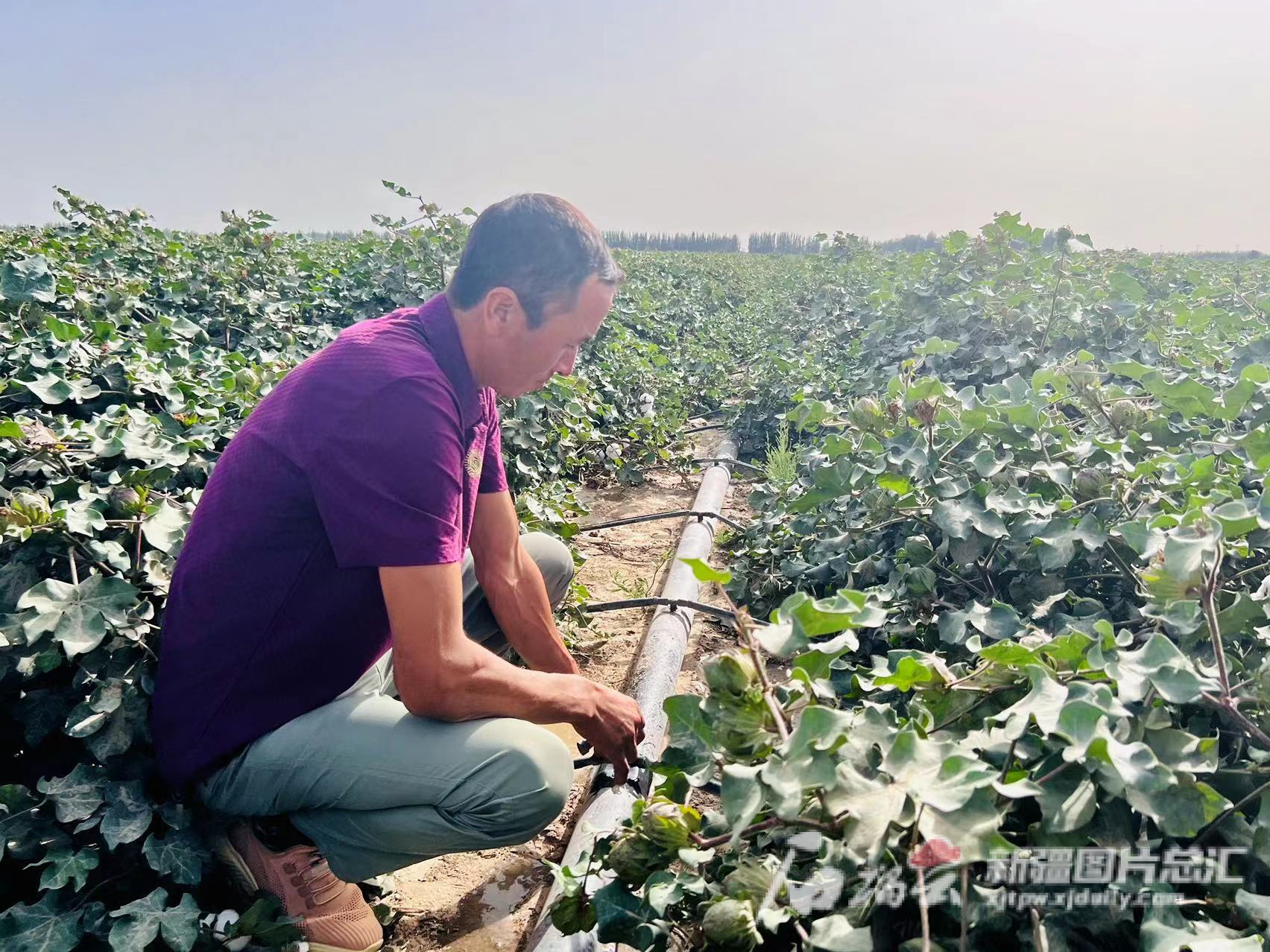 农户阿布来海提·依地力司在田间巡视检查滴灌水管。石榴云/新疆日报记者 康颢严摄