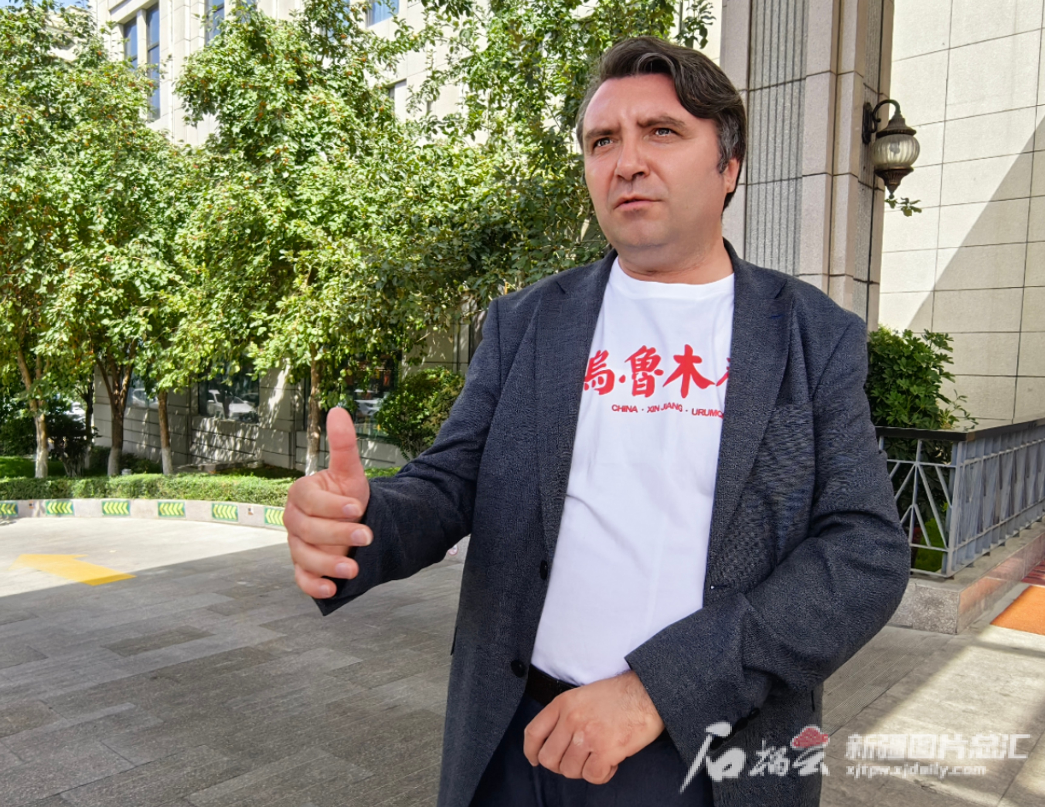 瓦列里·苏尔加诺夫身着一件印有“乌鲁木齐”字样的T恤,向记者详细介绍哈萨克斯坦媒体如何开展“一带一路”相关报道。石榴云/新疆日报记者 管梦颖摄