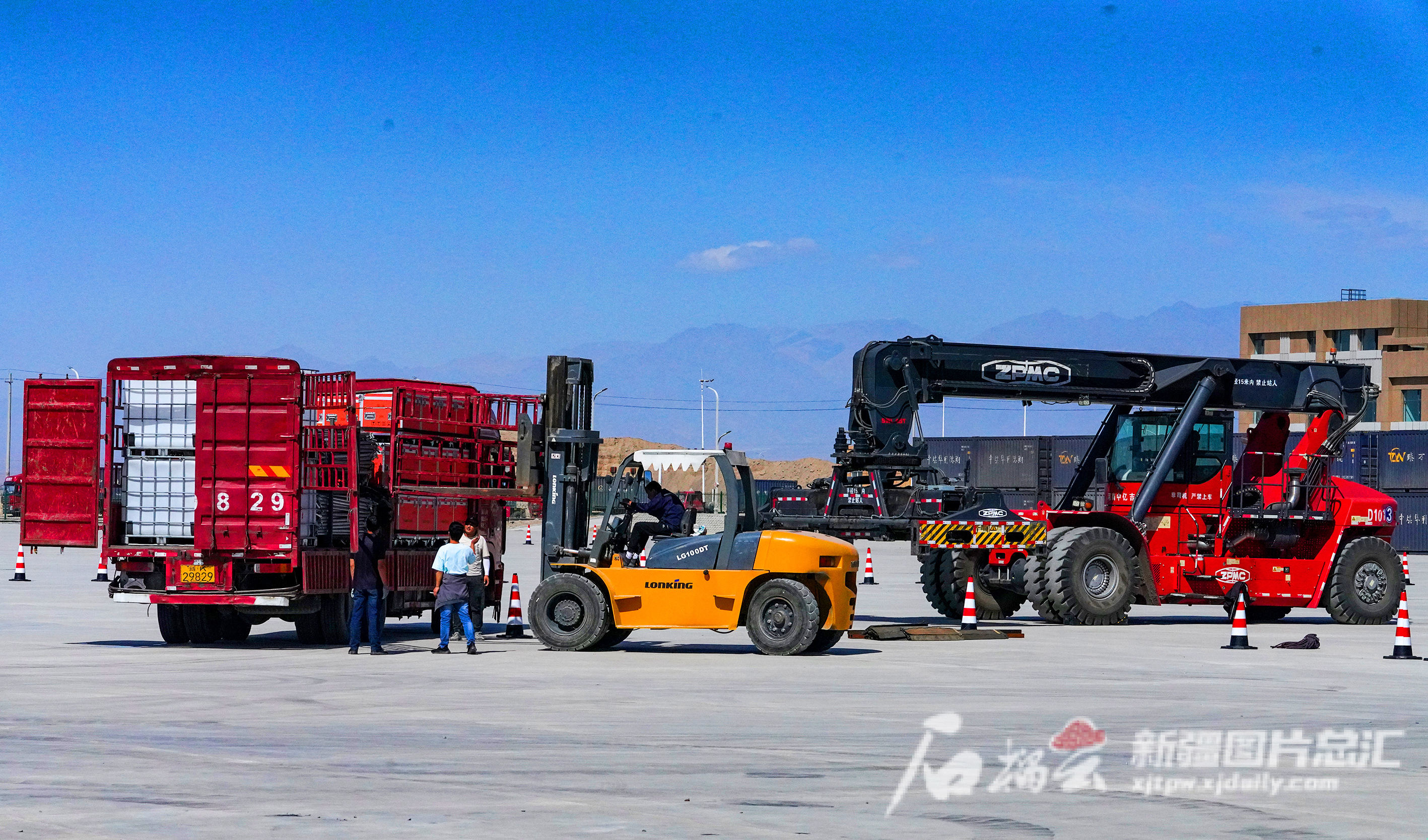 9月20日,哈密陆港中心城北物流港物流园工作人员在装运货物。普拉提·尼亚孜摄