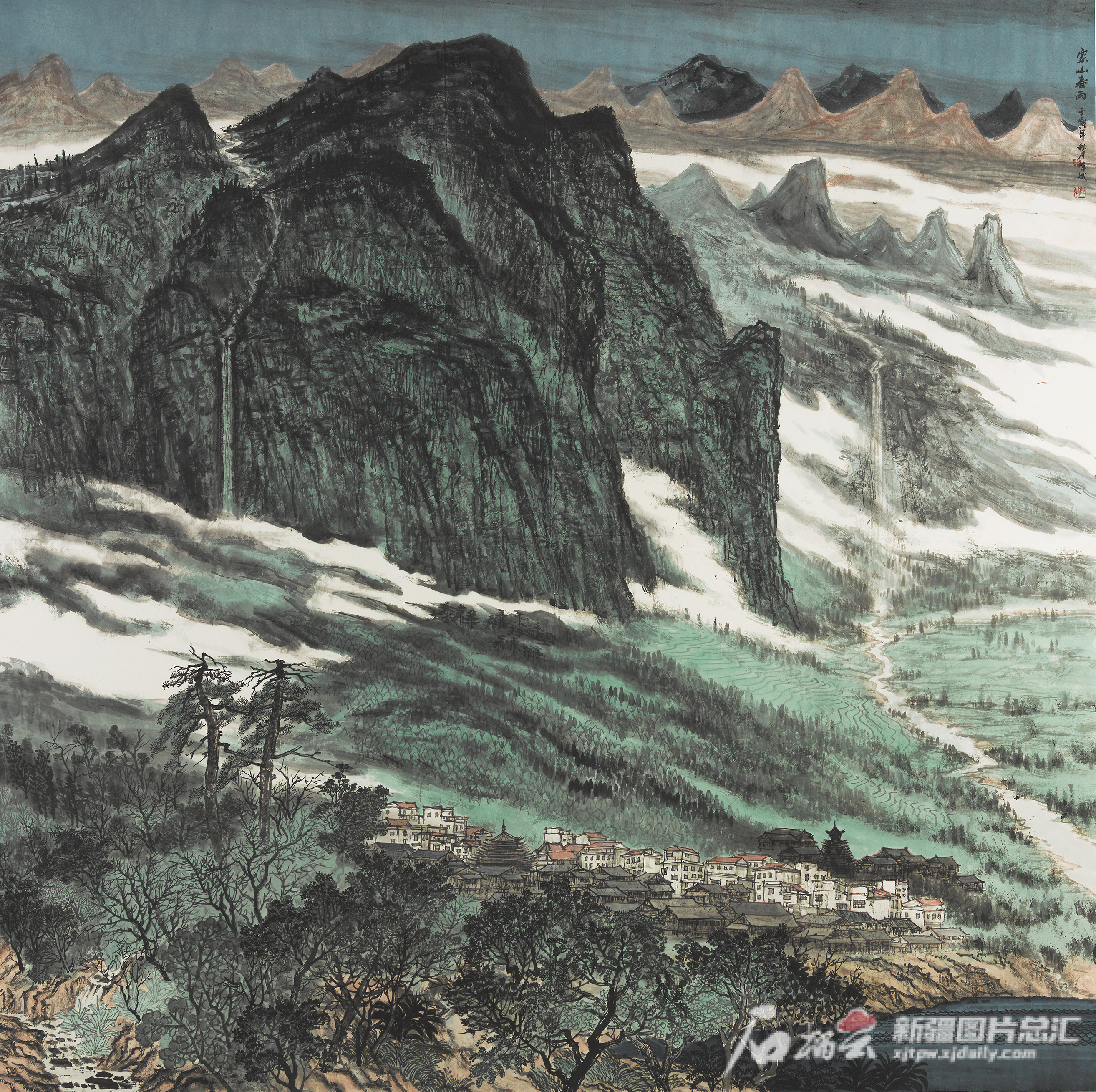 “石榴结硕果•和美新时代”五城市美术作品交流展展出的画作《家山雨后》(韦伟斌 作) (图片由乌鲁木齐市文化馆提供)