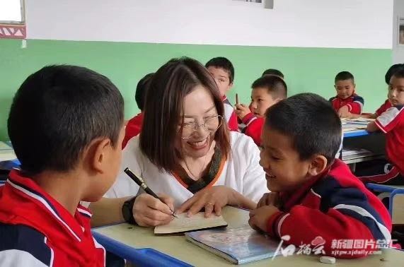 9月7日,疏勒县第4小学教室里,山东援疆教师周金花正在辅导学生功课。努尔阿力木江·阿卜力米提摄