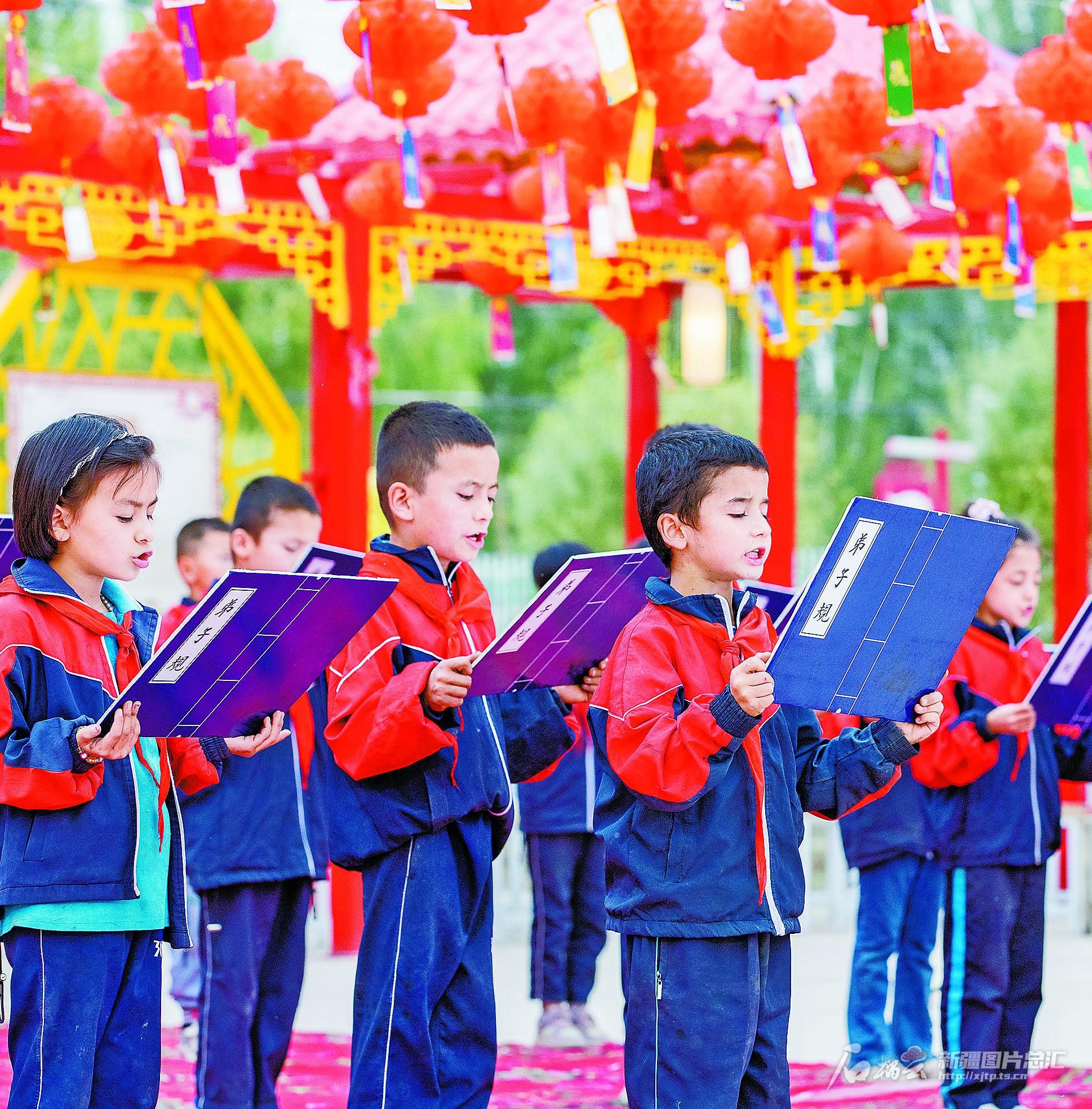 9月26日,学生诵读《弟子规》。当日,泽普县依克苏乡托皮恰村举办“迎中秋 庆国庆”活动,大家欢聚一堂,共迎双节。 张昀摄