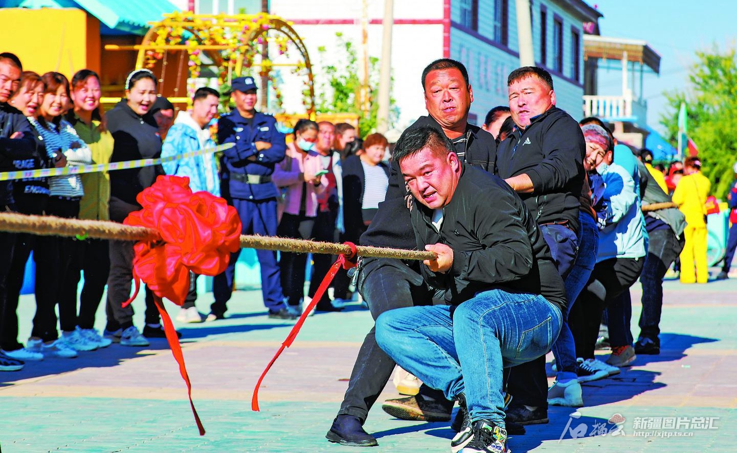 9月28日,干部群众一起拔河。当日,呼图壁县二十里店镇开展系列联谊活动,各族干部群众共庆双节。 王俊伟摄