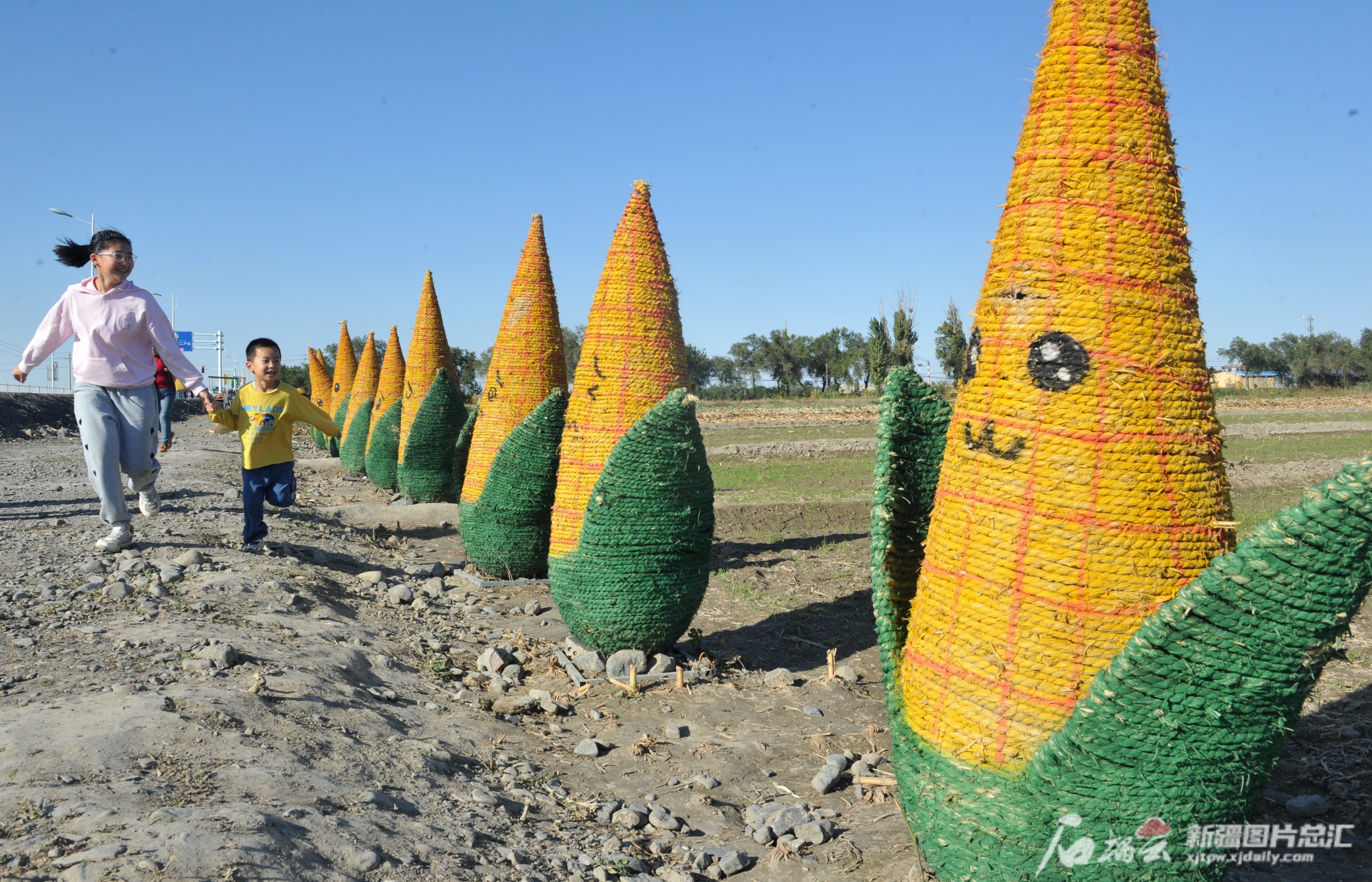 10月2日,游客在乌鲁木齐市米东区三道坝镇的稻草人景观道玩耍。