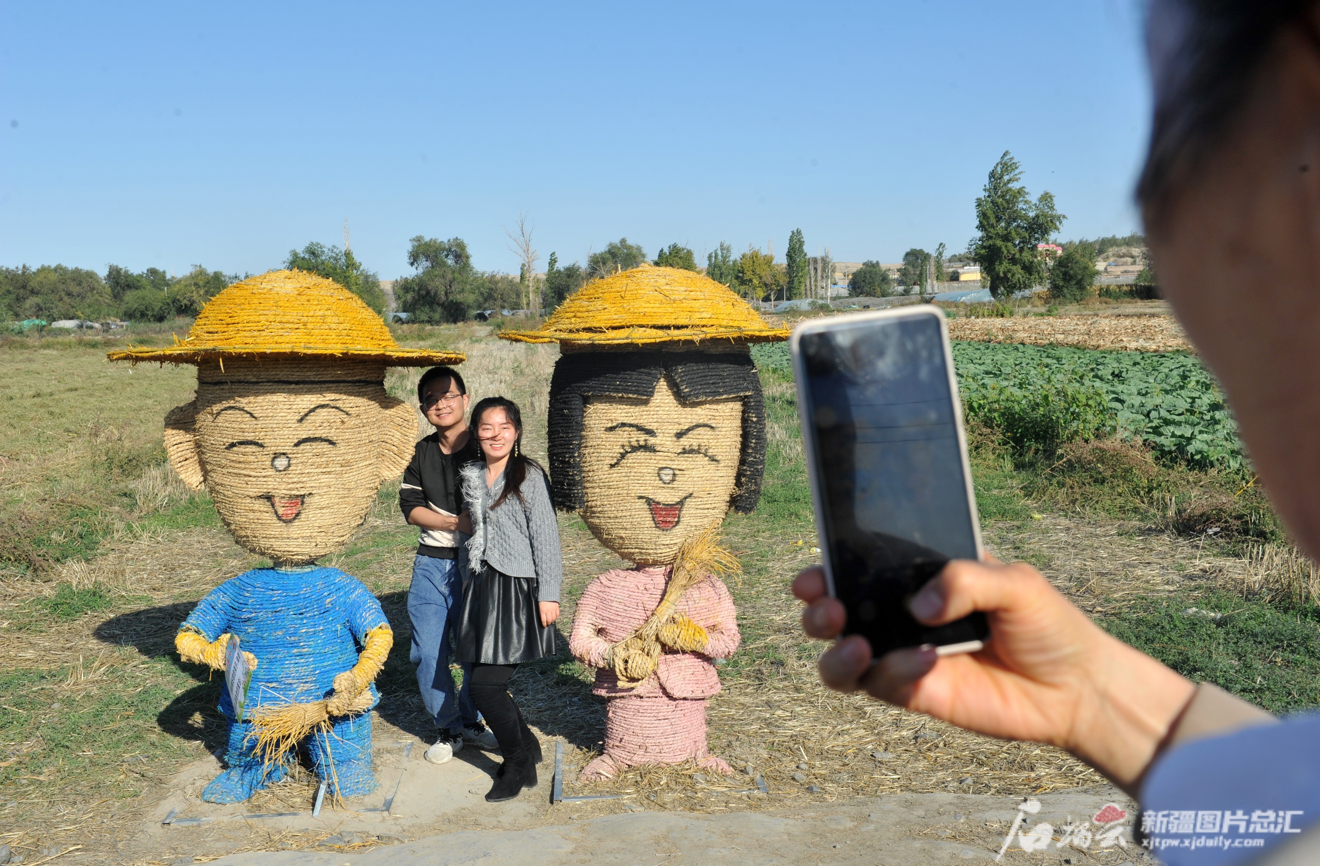 10月2日,游客在乌鲁木齐市米东区三道坝镇的稻草人景观道合影留念。