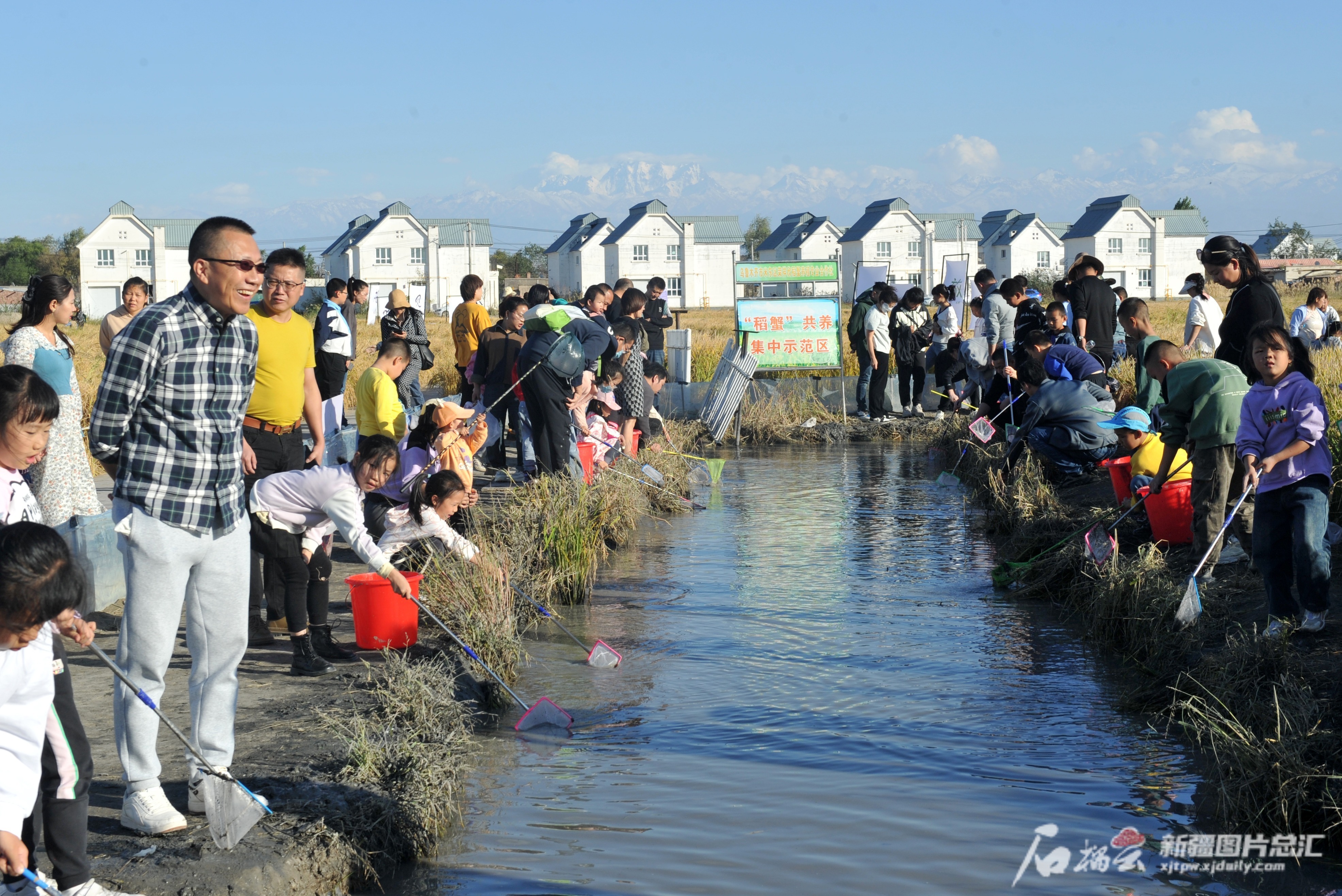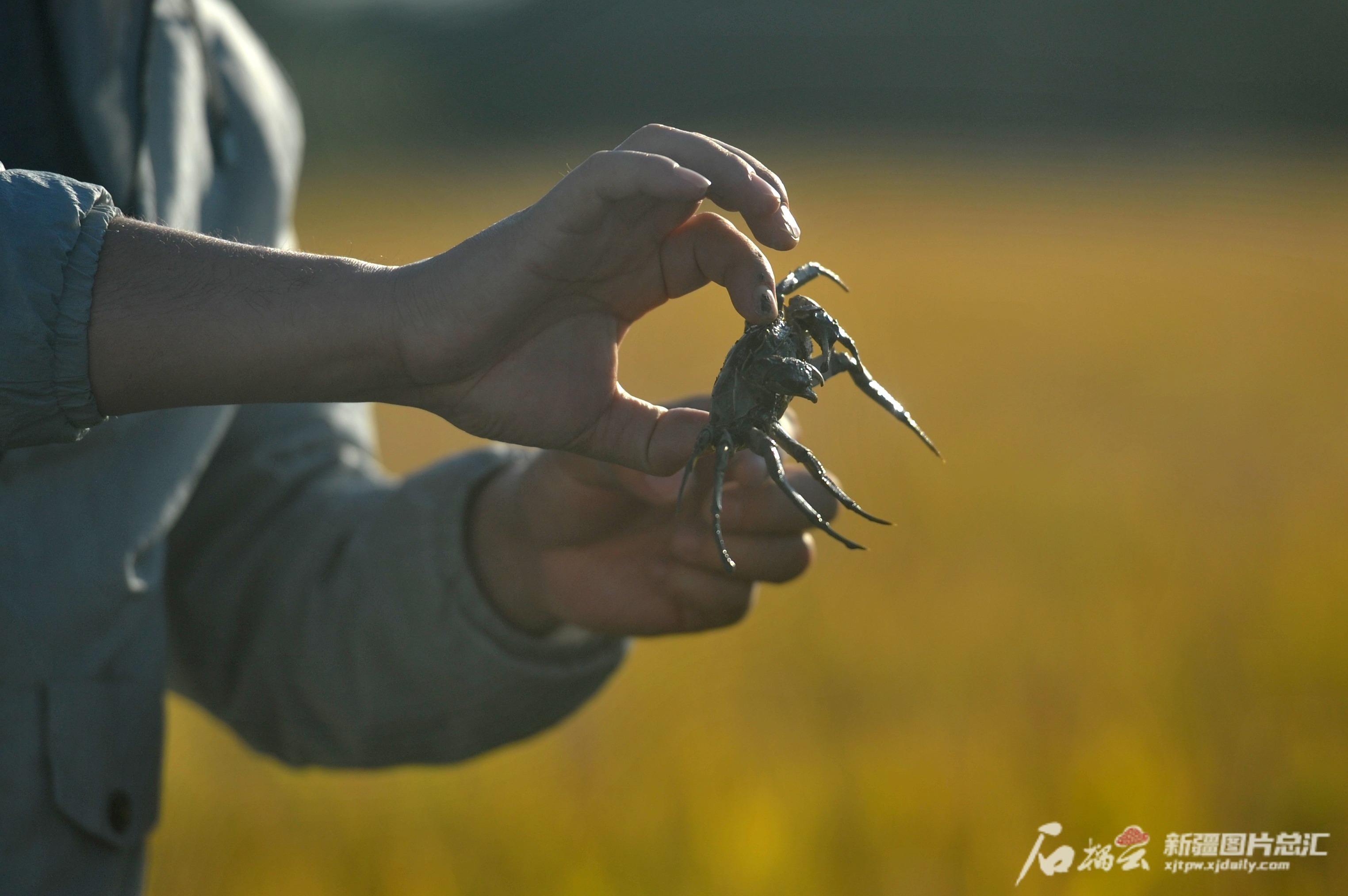 10月2日,游客在位于乌鲁木齐市米东区三道坝镇杜家庄村的荣祥欣稻蟹养殖专业合作社稻田里抓螃蟹。