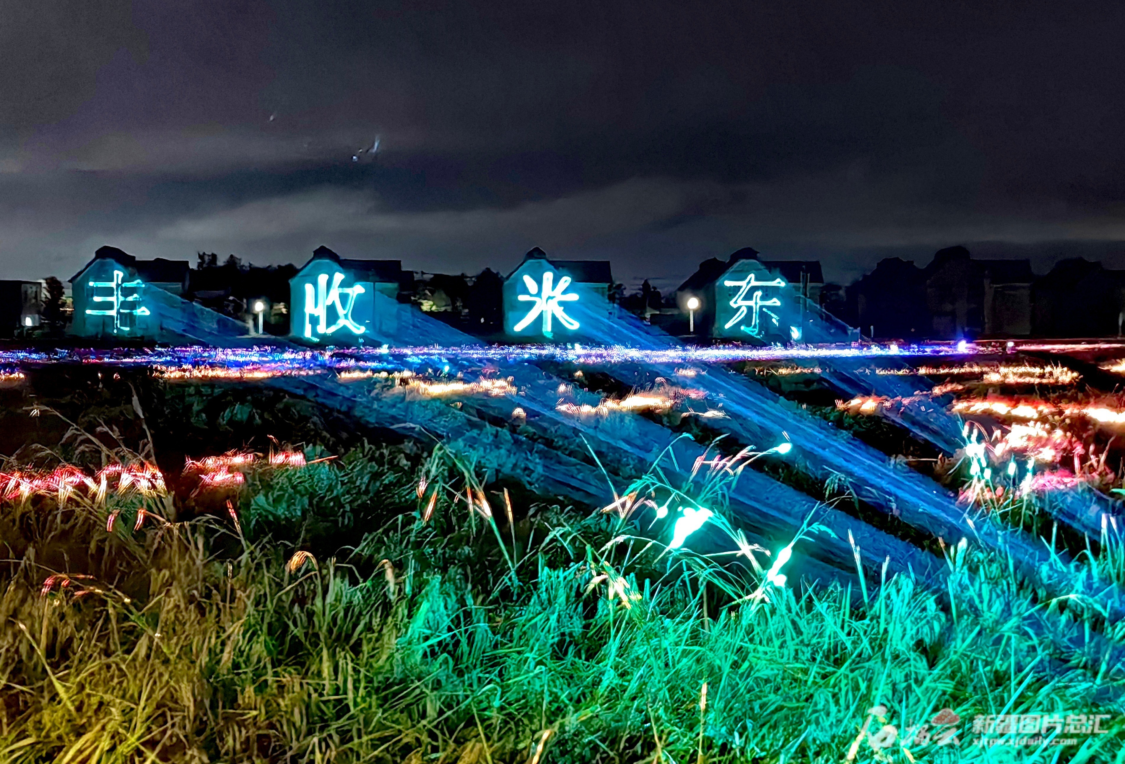10月2日,乌鲁木齐市米东区三道坝镇杜家庄村荣祥欣稻蟹养殖专业合作社的稻田里上演激光秀。