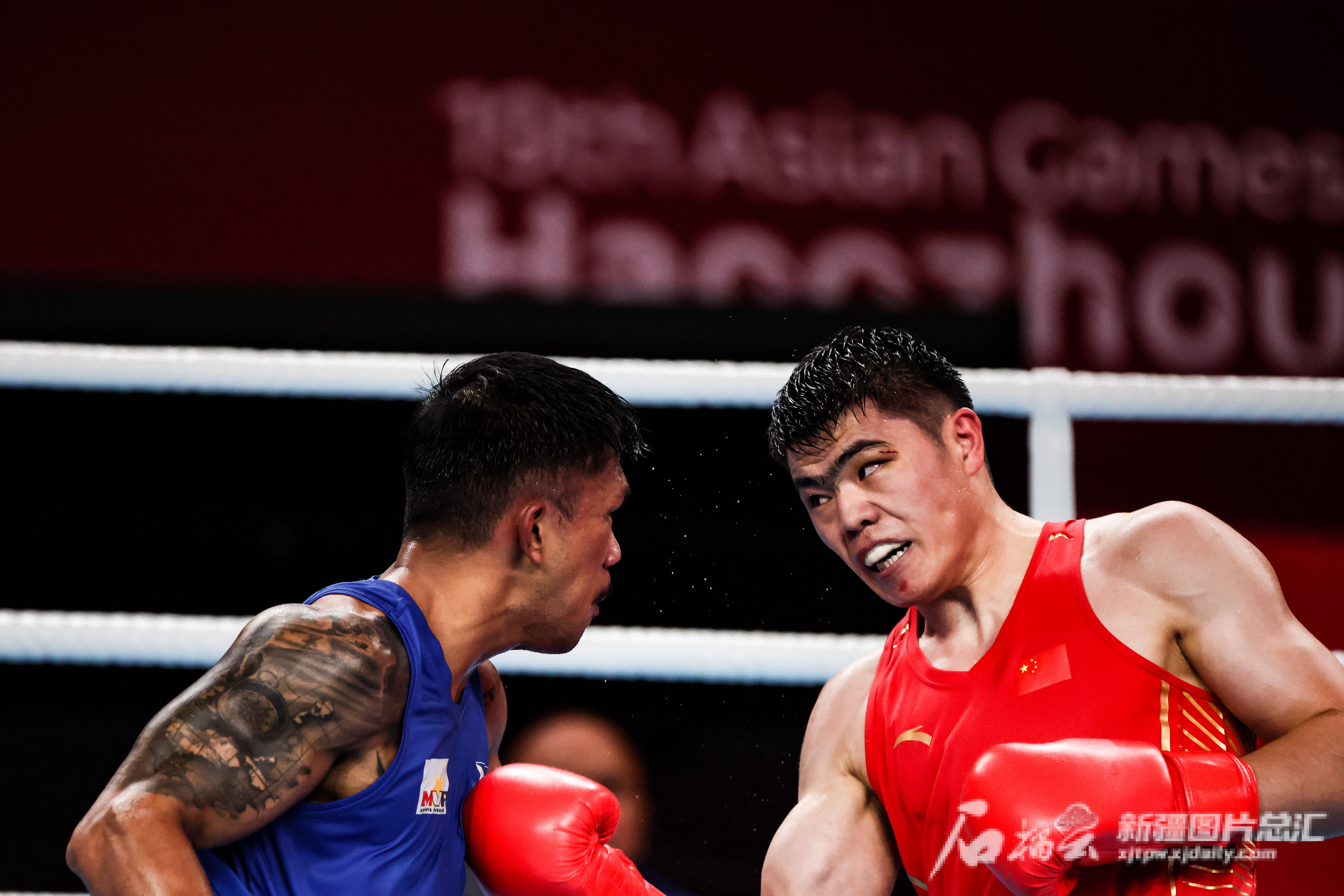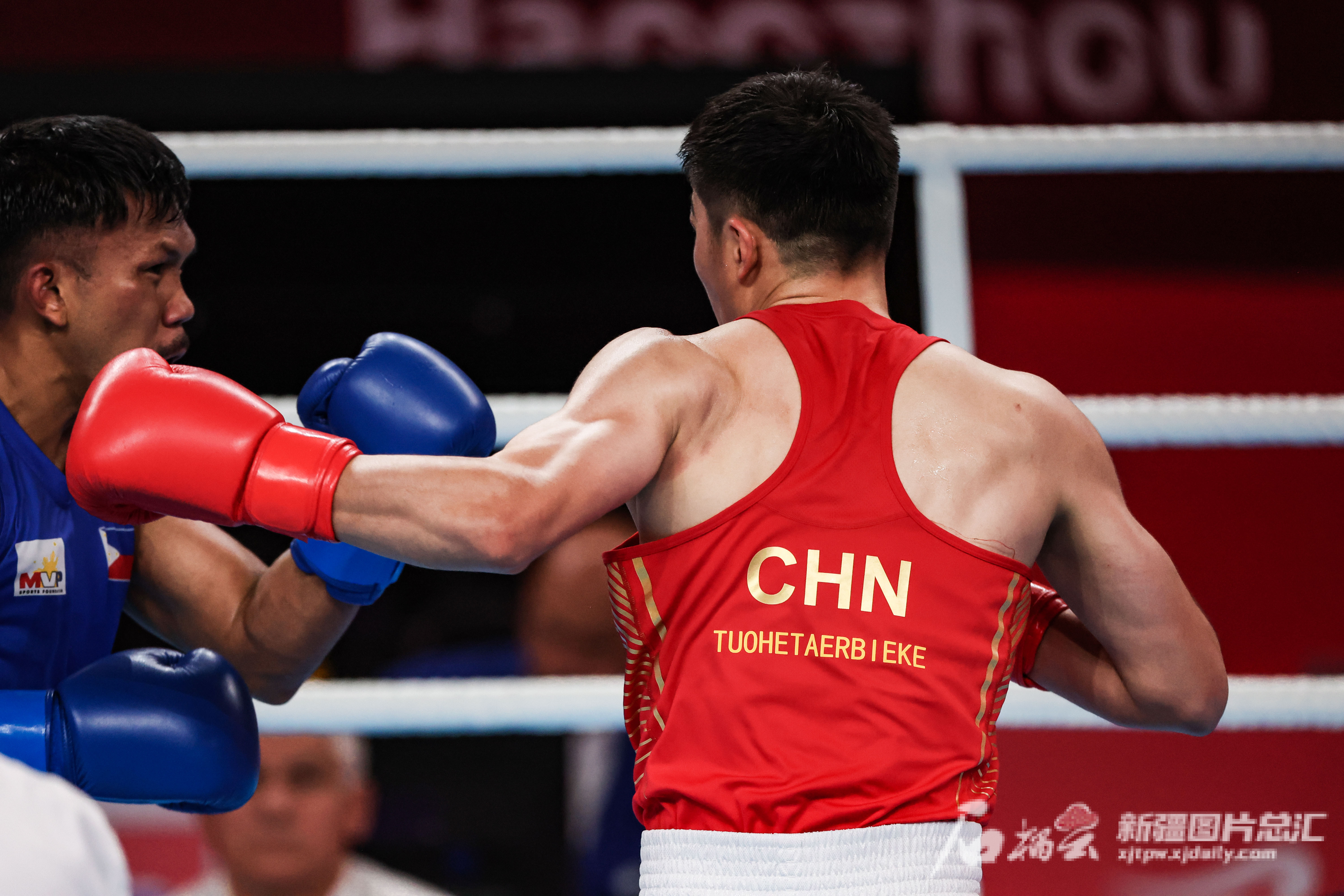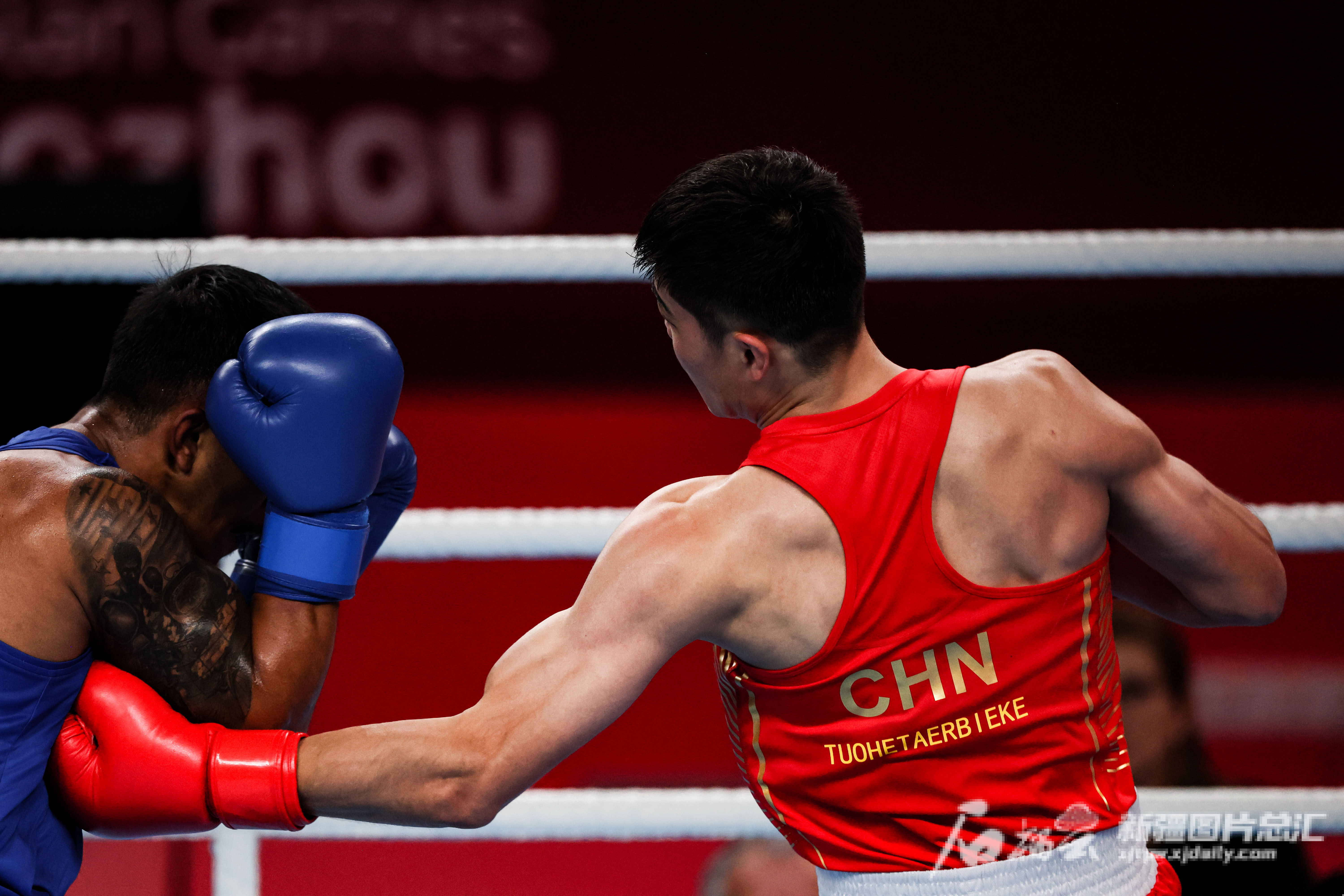 10月5日,在杭州亚运会拳击男子80公斤级决赛中,中国选手托合塔尔别克·唐拉提汗比赛精彩瞬间。