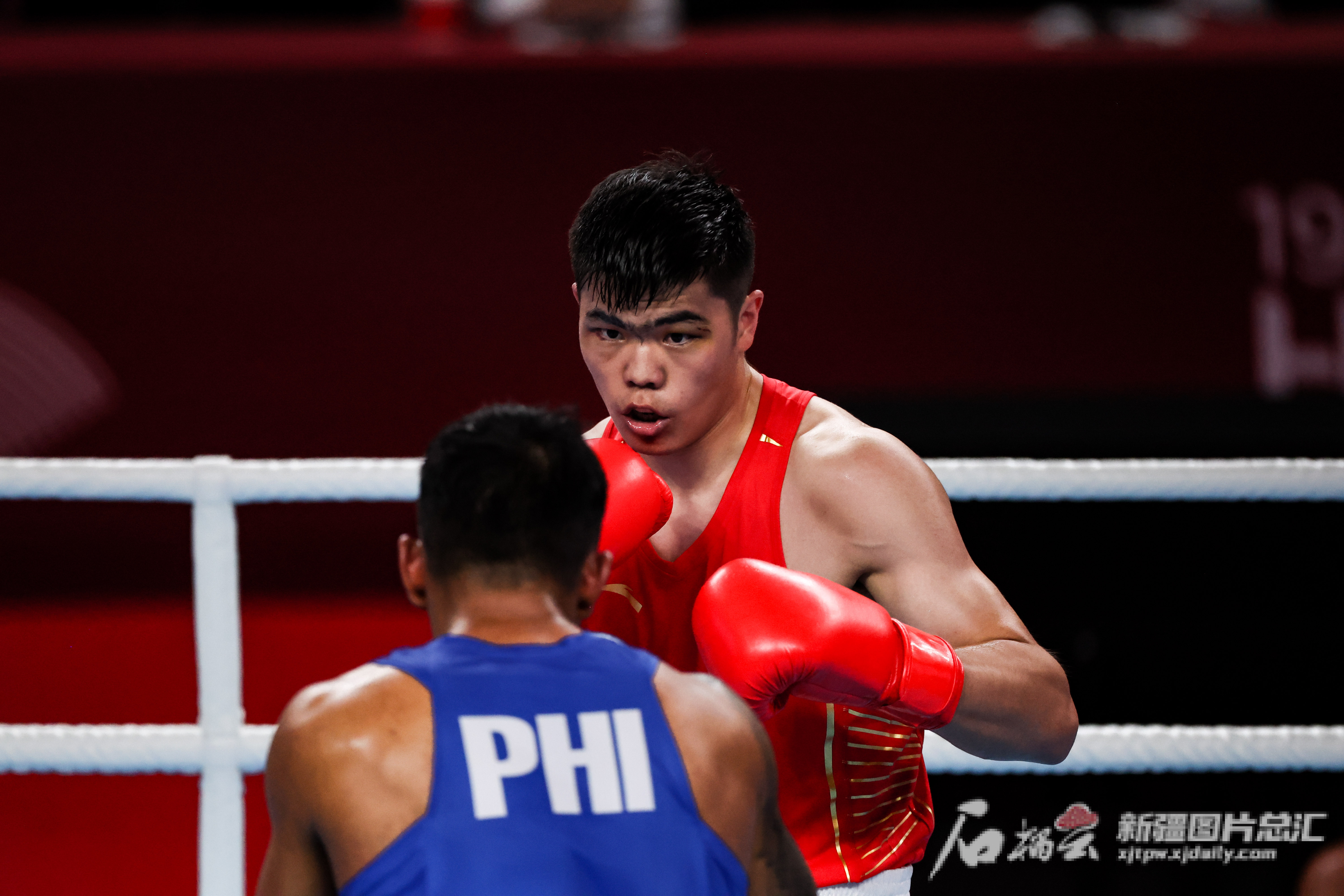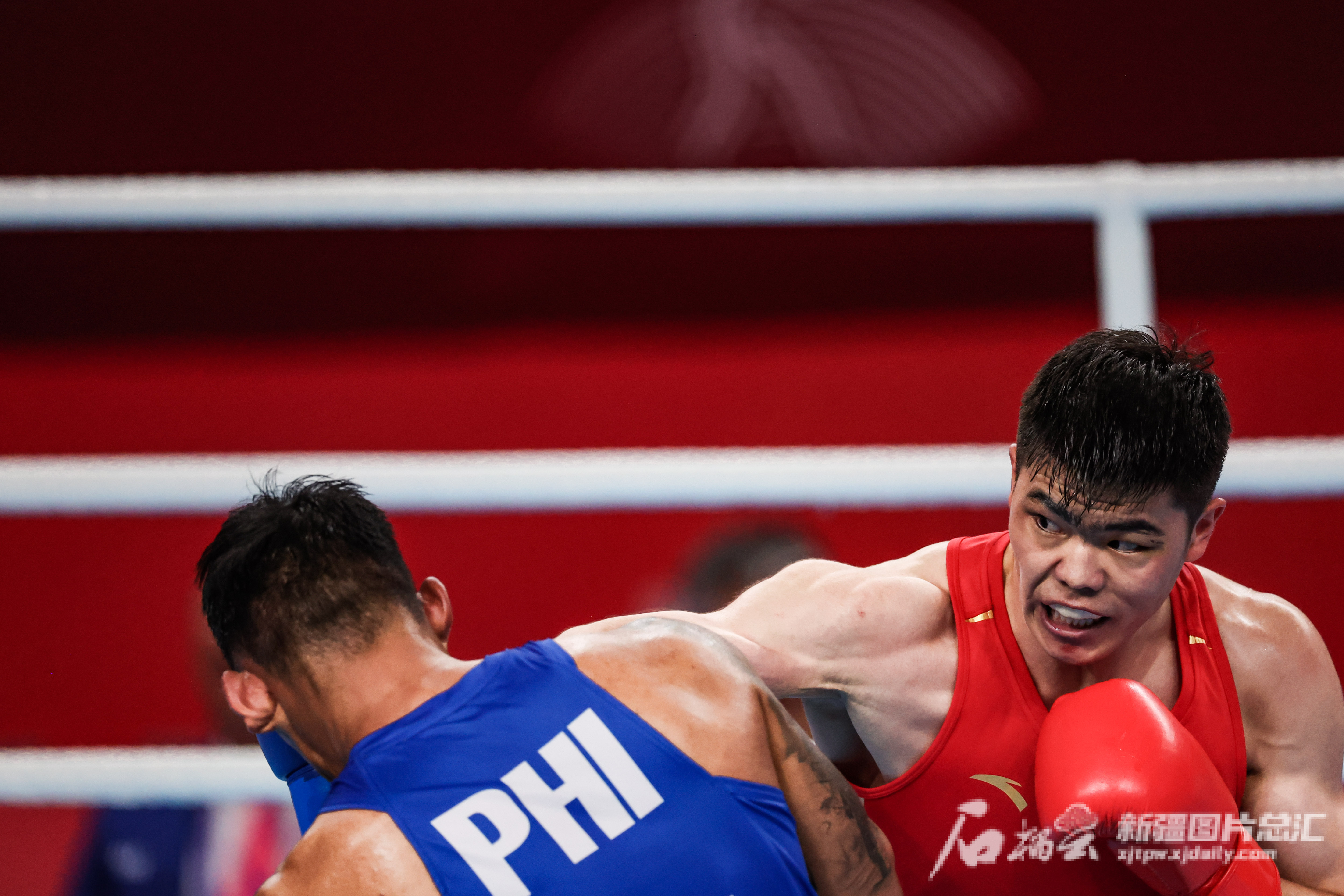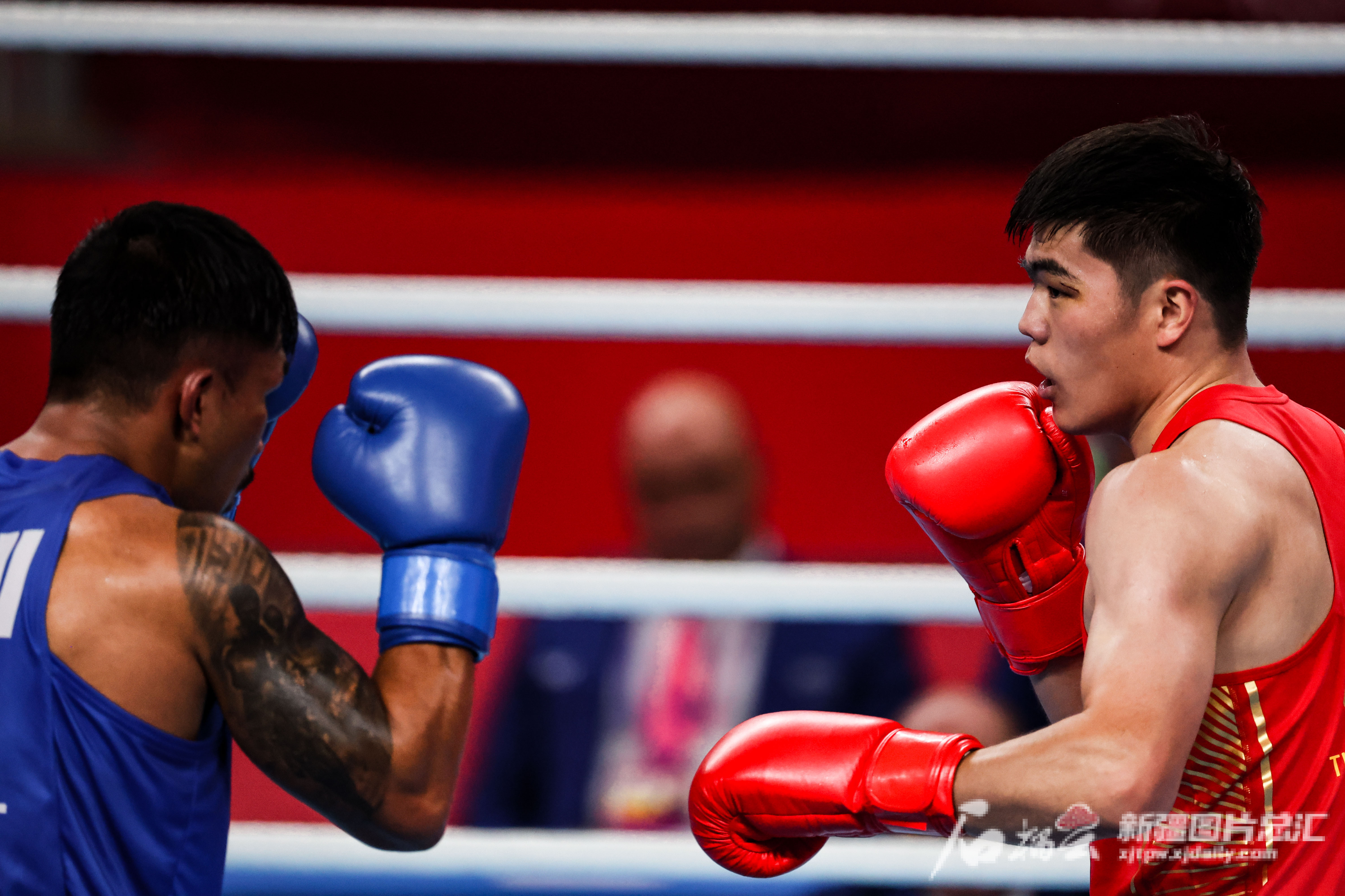 10月5日,在杭州亚运会拳击男子80公斤级决赛中,中国选手托合塔尔别克·唐拉提汗比赛精彩瞬间。