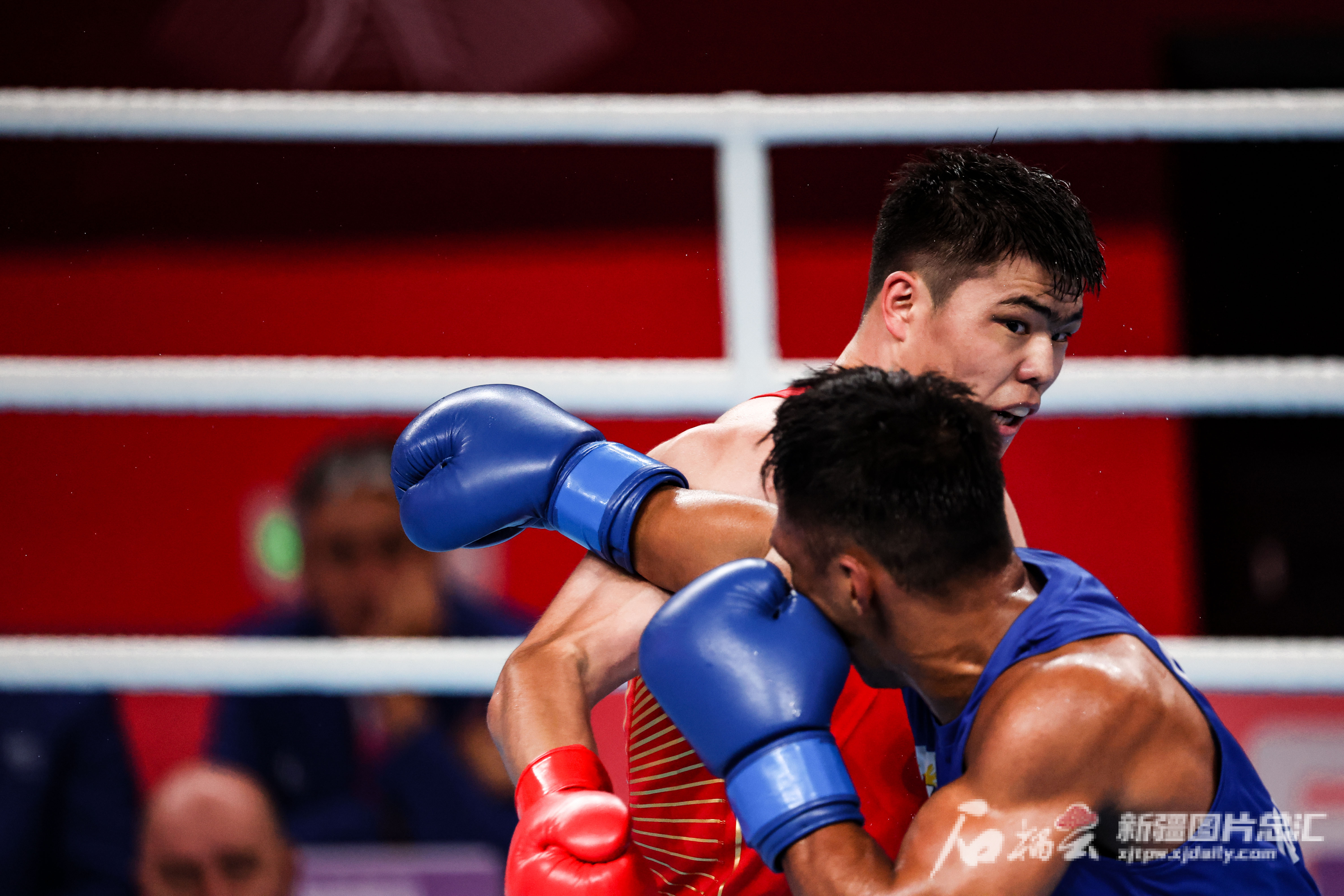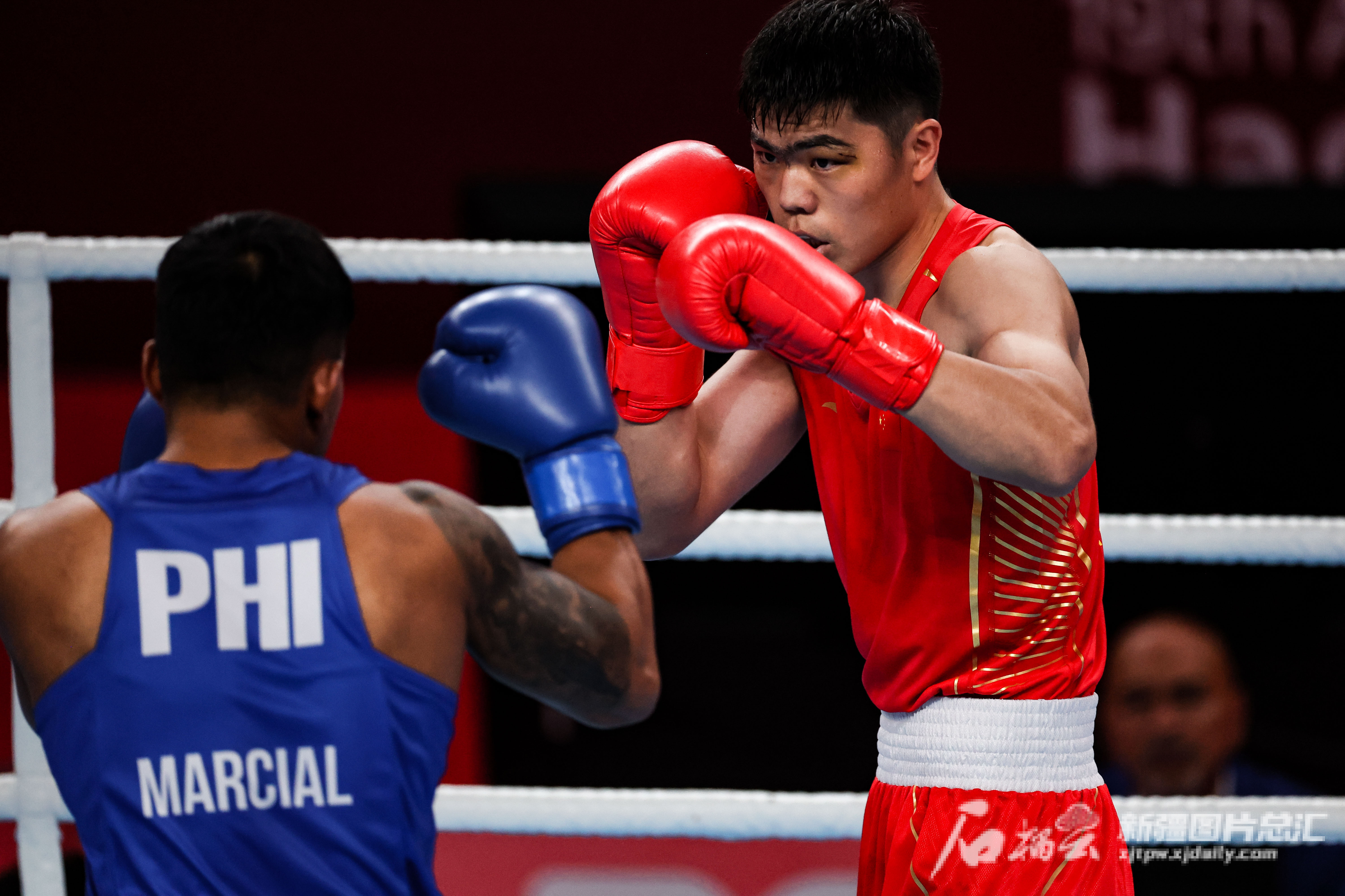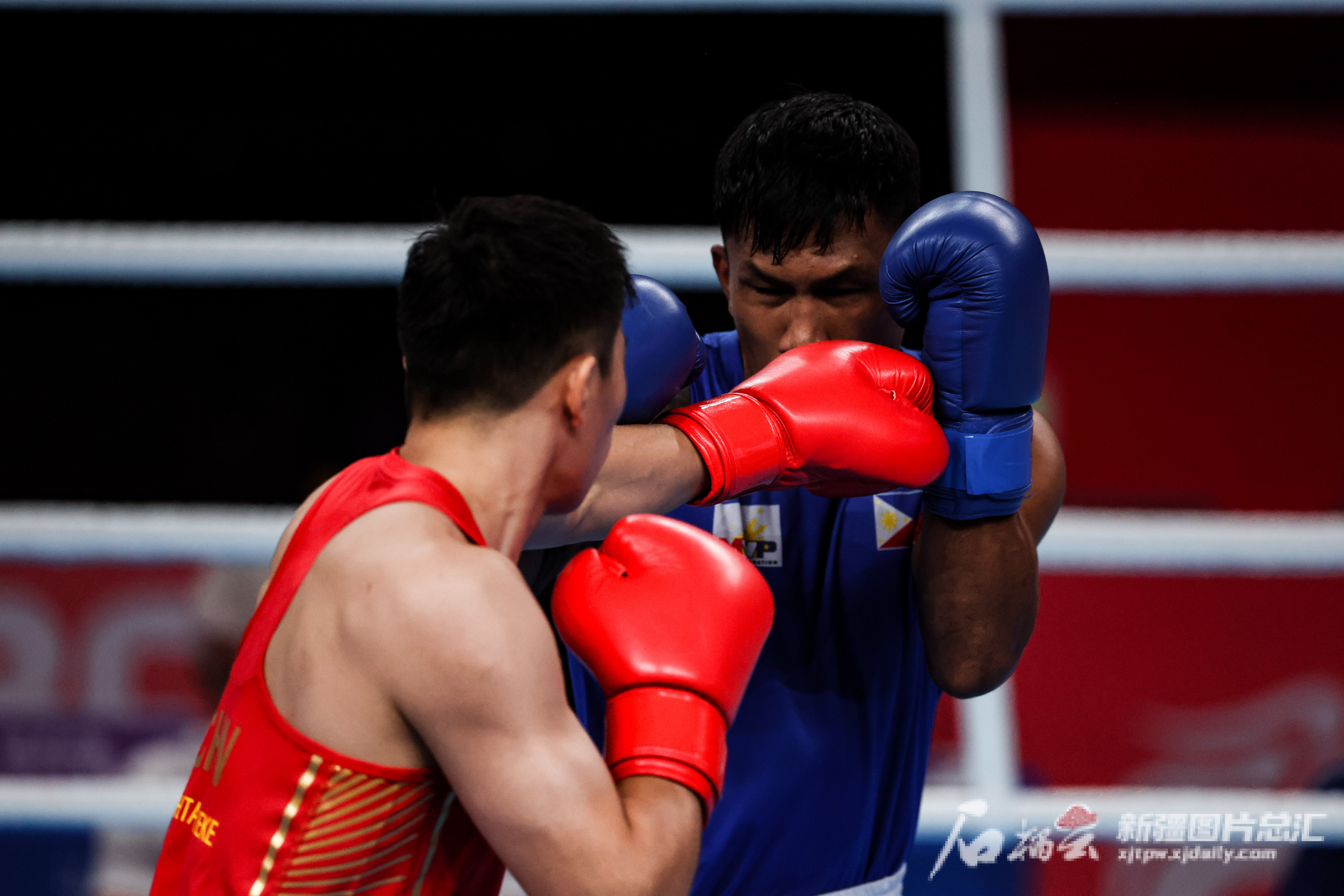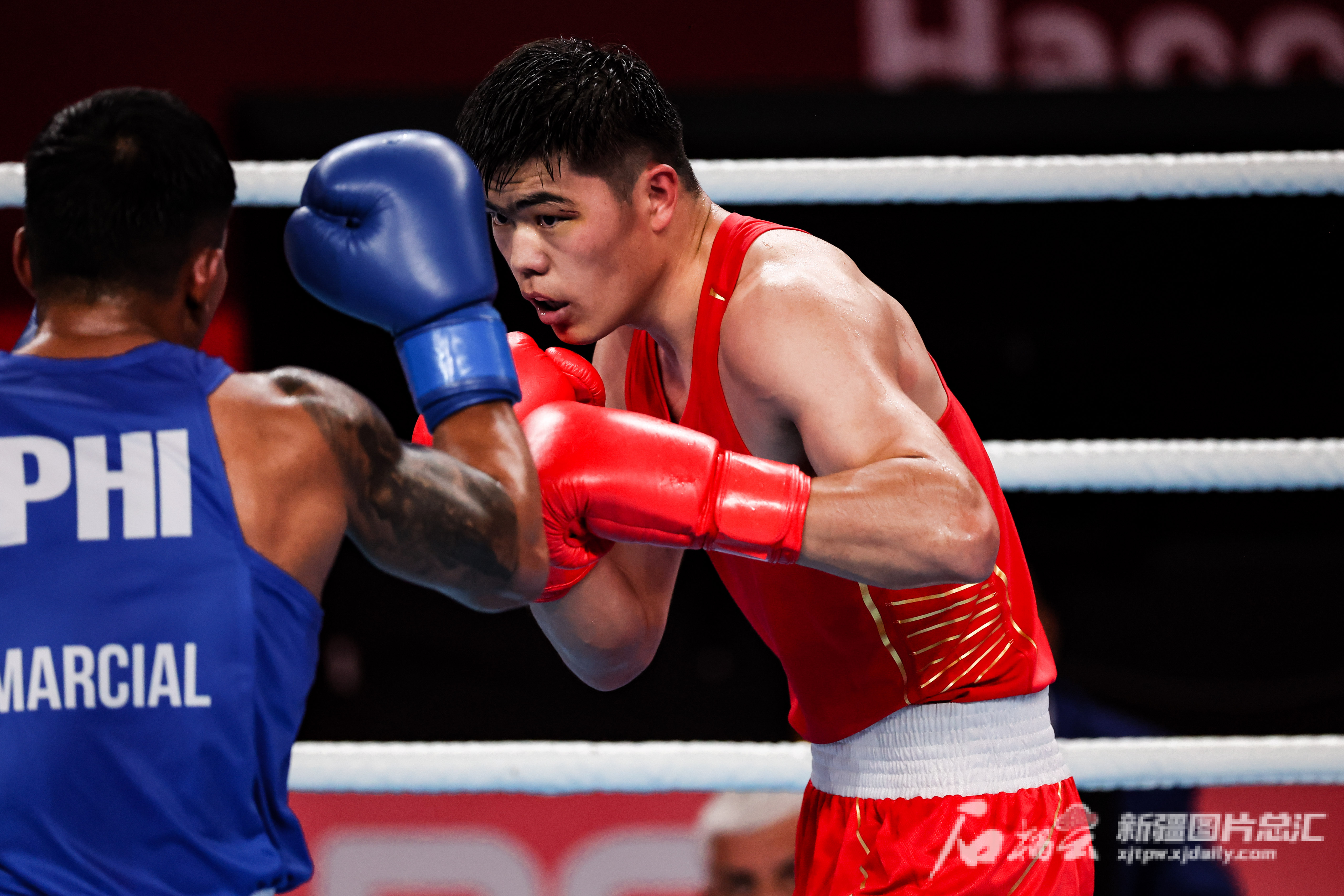 石榴云/新疆日报讯(记者 吕伊晗摄影报道)10月5日21时,中国选手托合塔尔别克·唐拉提汗在杭州亚运会拳击男子80公斤级决赛中,战胜菲律宾选手尤米尔·费利克斯·马西亚,勇夺金牌,创中国队新疆拳击运动员在亚运会上的最好成绩。